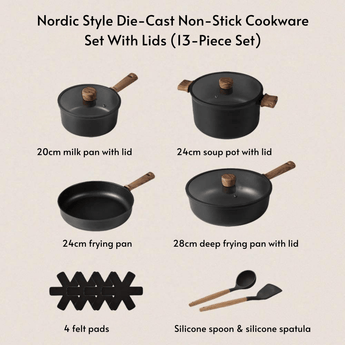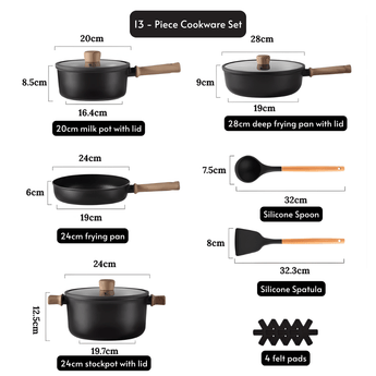 Experience effortless cooking with this 13-piece titanium-coated non-stick cookware set. Made from durable aluminum alloy, it ensures quick heat conduction and even cooking. Ideal for stir-frying, stewing, or boiling, this set combines performance, durability, and style for every modern kitchen.