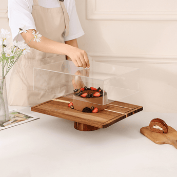 Our elegant wooden cake stand with a shatterproof acrylic lid adds charm to any table. Its versatile 2-in-1 design doubles as a dessert display and charcuterie board. Lightweight, durable, and space-saving, it's perfect for showcasing cakes, pastries, snacks, and cheese spreads with style.