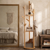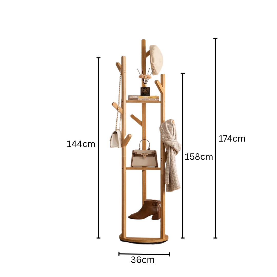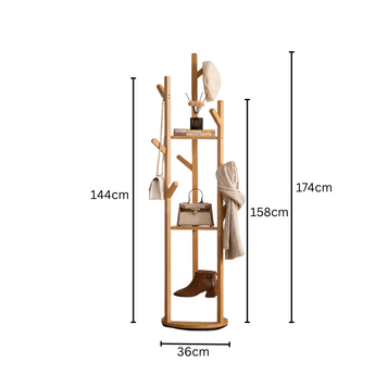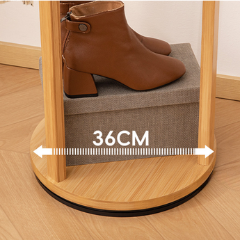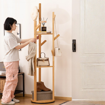 This rotating floor standing coat rack provides a practical storage solution for organizing clothes, hats, bags, and accessories. Designed with multiple hooks and shelves, it allows easy access from all sides with its 360 degree rotating structure while maintaining stability and efficient space usage in bedrooms or entryways.
