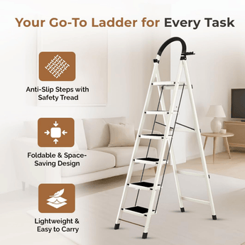 The 6-Step Foldable Iron Ladder for Home is a sturdy and reliable tool designed for everyday household tasks. Built with durable carbon mild steel, it provides excellent stability and support, making it ideal for reaching high shelves, cleaning, or DIY projects. Its foldable design ensures easy storage when not in use, saving valuable space. With anti-slip steps and a strong frame, this ladder is both safe and practical for home use.