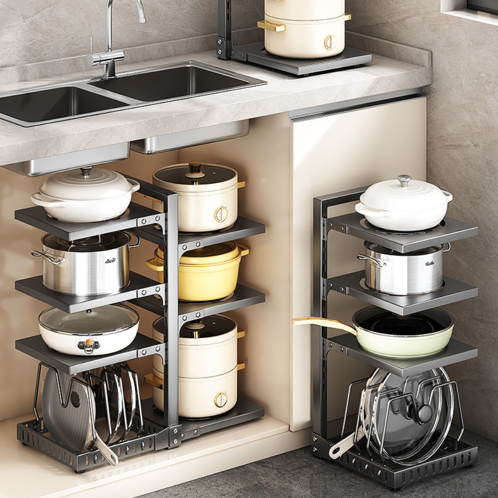 Maximize your kitchen space with this adjustable 7-tier pot and pan organizer rack. Designed to keep cookware neatly arranged, it features a durable stainless steel build with an impressive load capacity. The customizable tier design allows you to adjust the shelves to fit various pot and pan sizes, making it perfect for countertops, cabinets, or under-sink storage. Its sturdy, anti-rust structure ensures long-lasting performance, while the tool-free assembly makes installation effortless.
