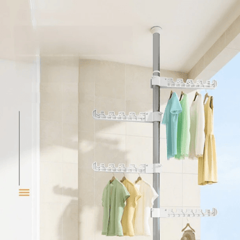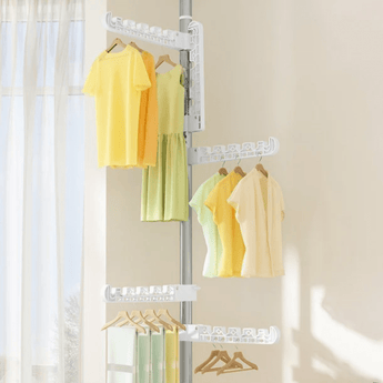 Maximize your vertical space with this stainless steel floor-to-ceiling clothes rack. Built with durable materials, it offers adjustable height and 360° rotating arms for flexible organization. Designed for stability with tension-mounted rods and thick padding, it’s perfect for small rooms, closets, or corners. Rust-resistant and tool-free to install, this rack handles up to 10 kg per arm. Whether you're hanging clothes, scarves, or bags, this rack turns any vertical space into efficient storage.