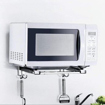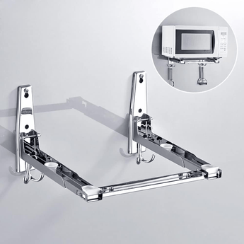 This sturdy wall-mounted stainless steel microwave rack is ideal for kitchens needing space-saving solutions. Adjustable, foldable, and rust-resistant, it supports heavy appliances and includes hooks for hanging kitchen tools.