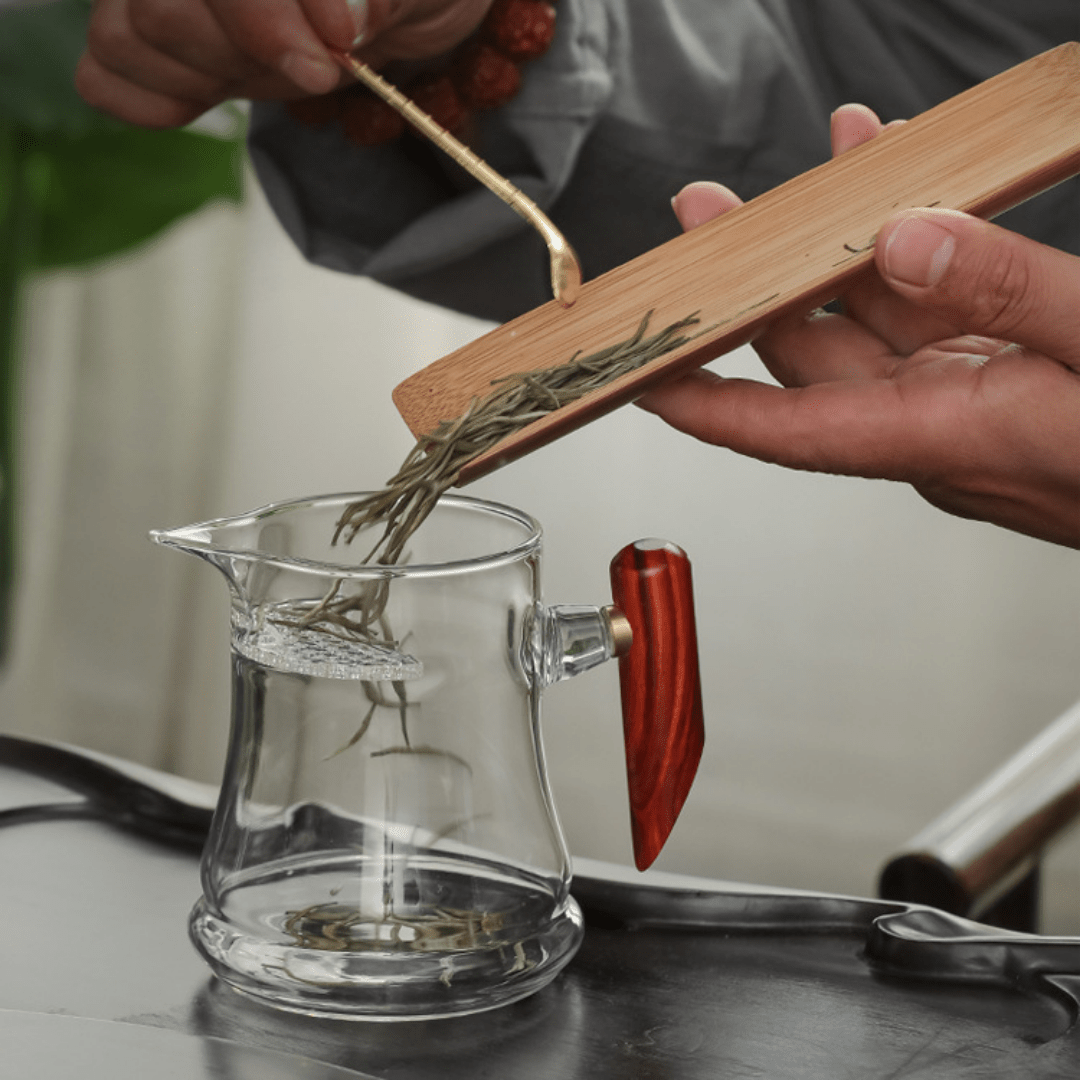 Ideal for serving green tea, herbal tea, and other infusions. Its sleek and sophisticated appearance makes it suitable for various settings, from casual home use to elegant tea ceremonies. The combination of glass and natural wood adds a touch of classic elegance to your tea rituals.