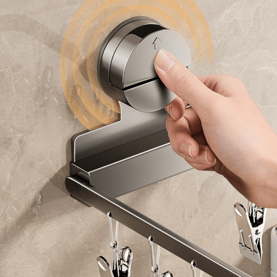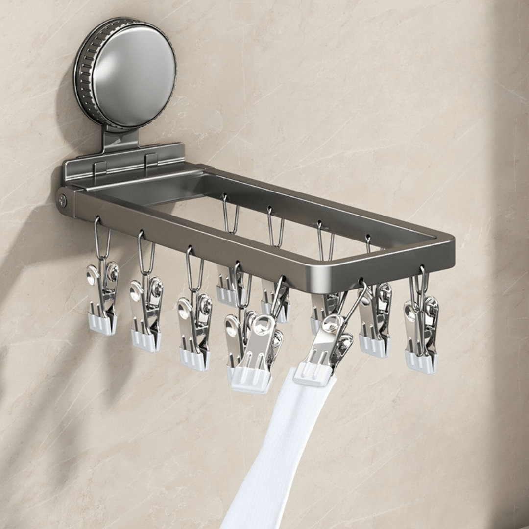 Maximize your drying space with our foldable suction cup sock drying rack. Designed with a strong clamping force, it securely holds socks, underwear, and small garments without slipping. The suction cup installation ensures a traceless, drill-free setup on smooth surfaces like bathrooms and balconies. Made from durable carbon steel, it features a space-saving foldable design for easy storage when not in use. The heavy-duty load-bearing capacity keeps your laundry organized while saving space efficiently.