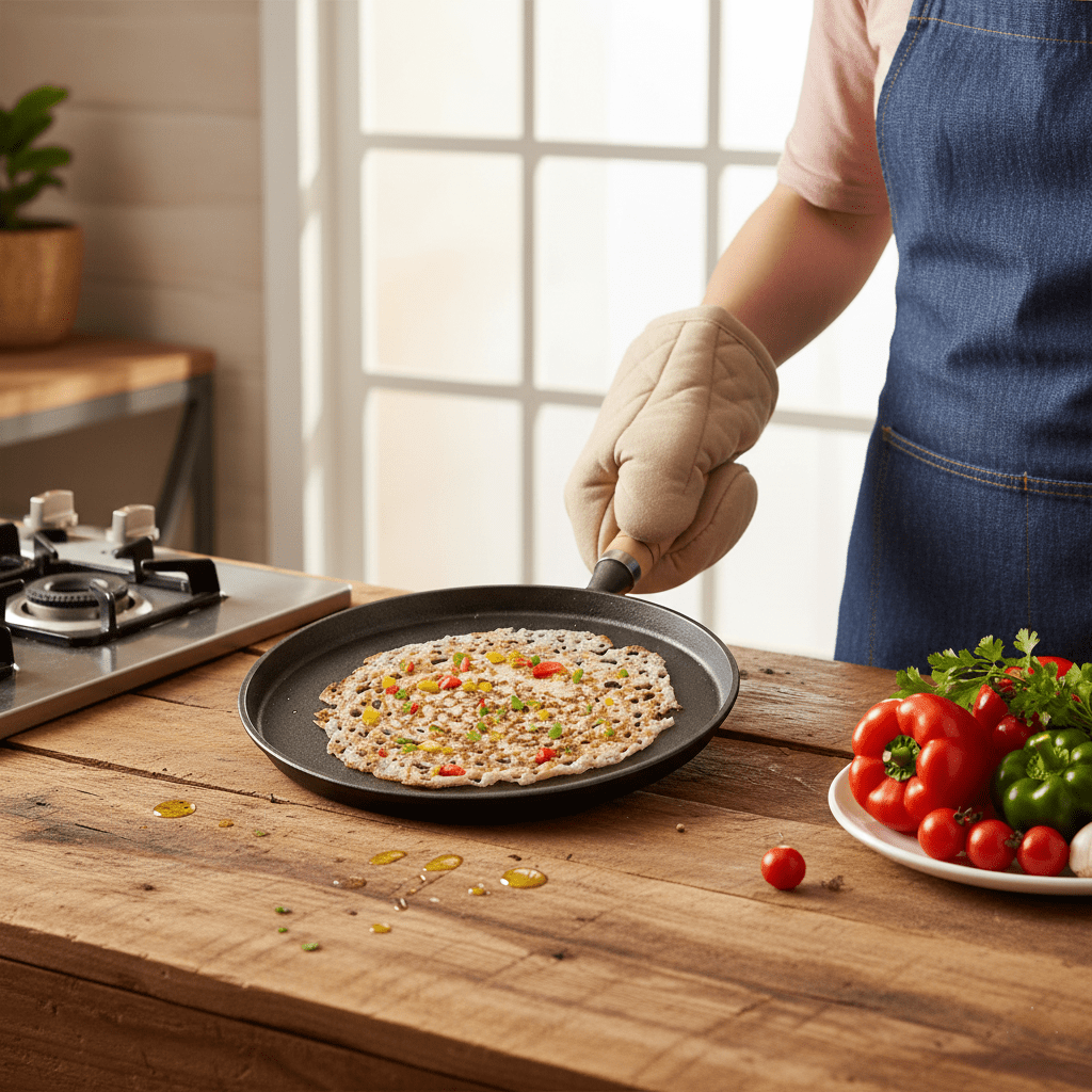 This cast iron tawa ensures strong heat retention, making it perfect for cooking delicate foods like dosas, chapatis, and pancakes.