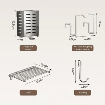 Includes 4 movable hooks, chopstick holder, sanitary ware basket, and cutting board stand. Easily attach and reposition based on your kitchen workflow and needs.