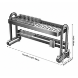 Streamline your kitchen with our Multi-Function Dish Rack, a double-layer stainless steel shelf designed for efficient sink-side organization. With compartments for dishes, utensils, chopping boards, and more, this rack maximizes storage without cluttering your counter. Thickened carbon steel brackets and anti-slip foot pads provide durability and stability. Easy to assemble and rust-resistant, it includes moveable hooks and smart partitions to keep everything in place. Ideal for modern kitchens looking to combine form with function.