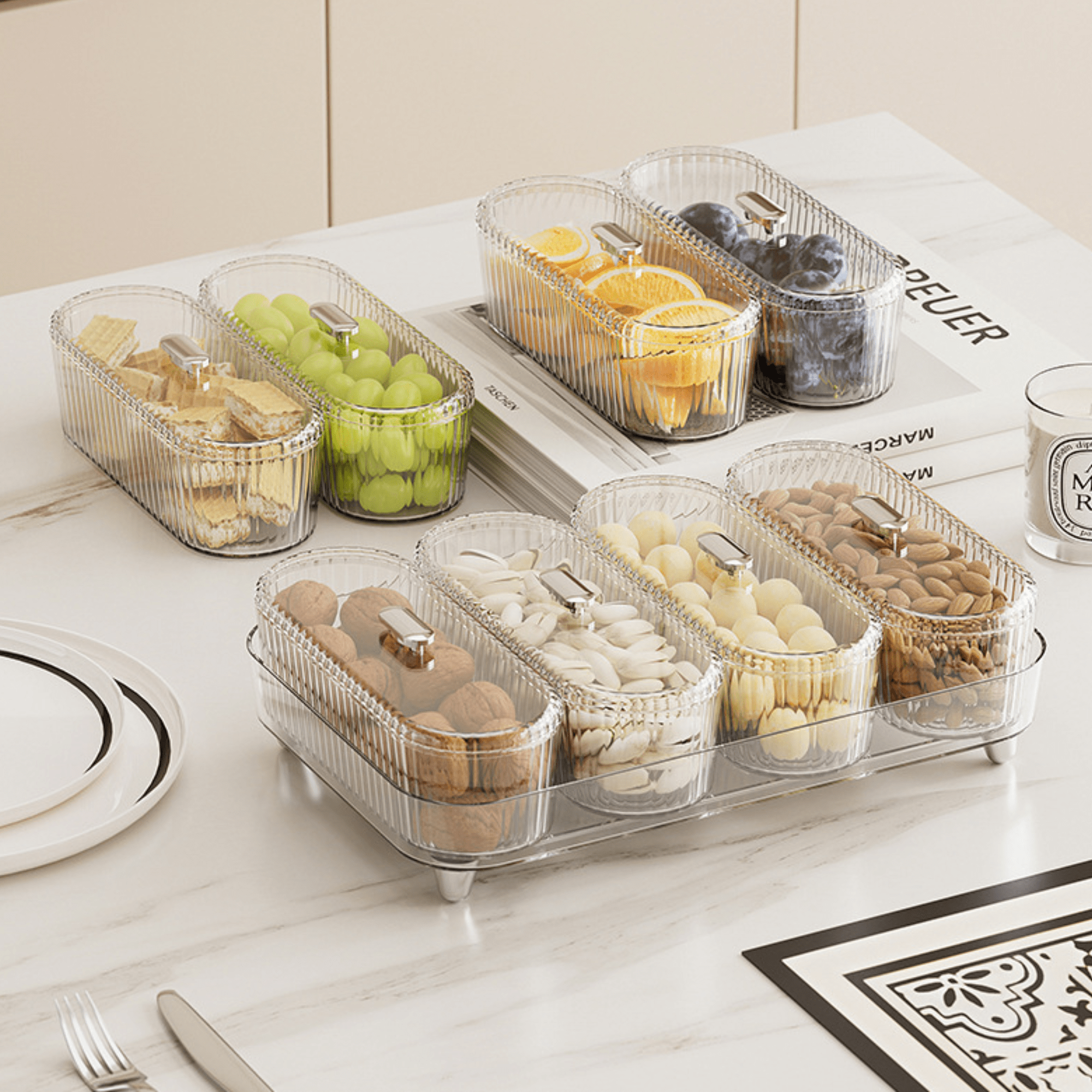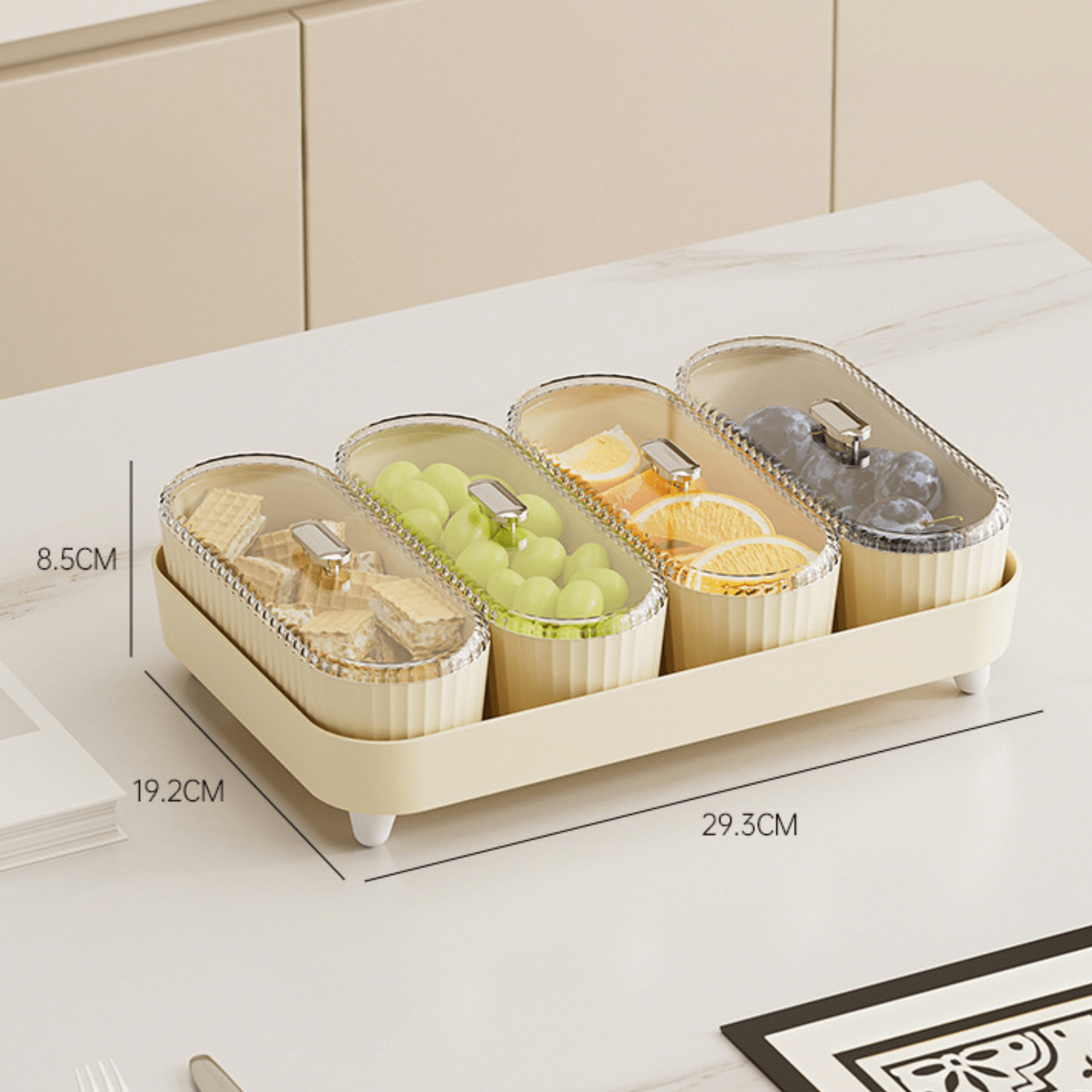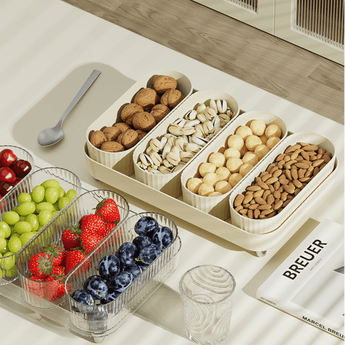5-in-1 Compartmental Organizer: Includes 4 removable containers and a base tray, helping you store snacks separately and neatly in one compact space.