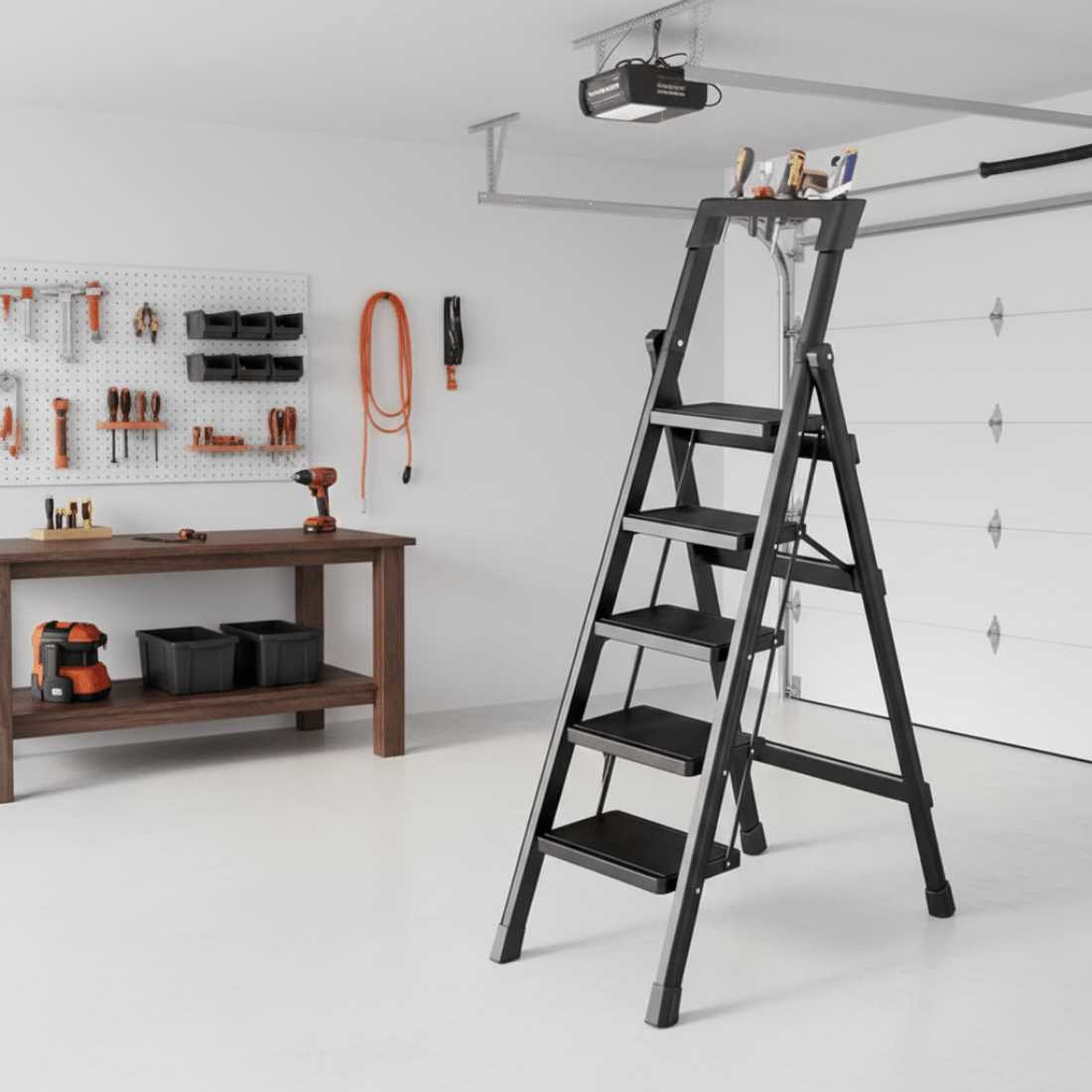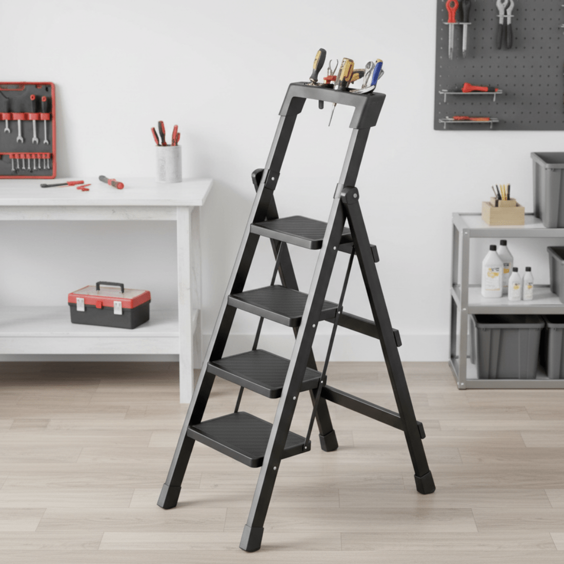 Built-In Tool Holder: Top tool platform holds tools, screws and accessories, keeping everything within reach and reducing the need for repeated climbing.