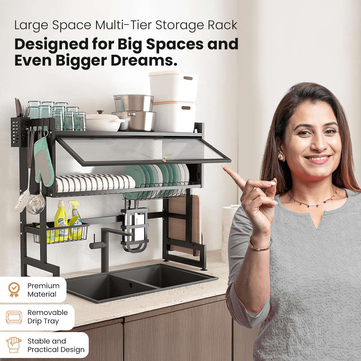- Design: Multi-layer with removable drip tray and anti-slip rubber feet