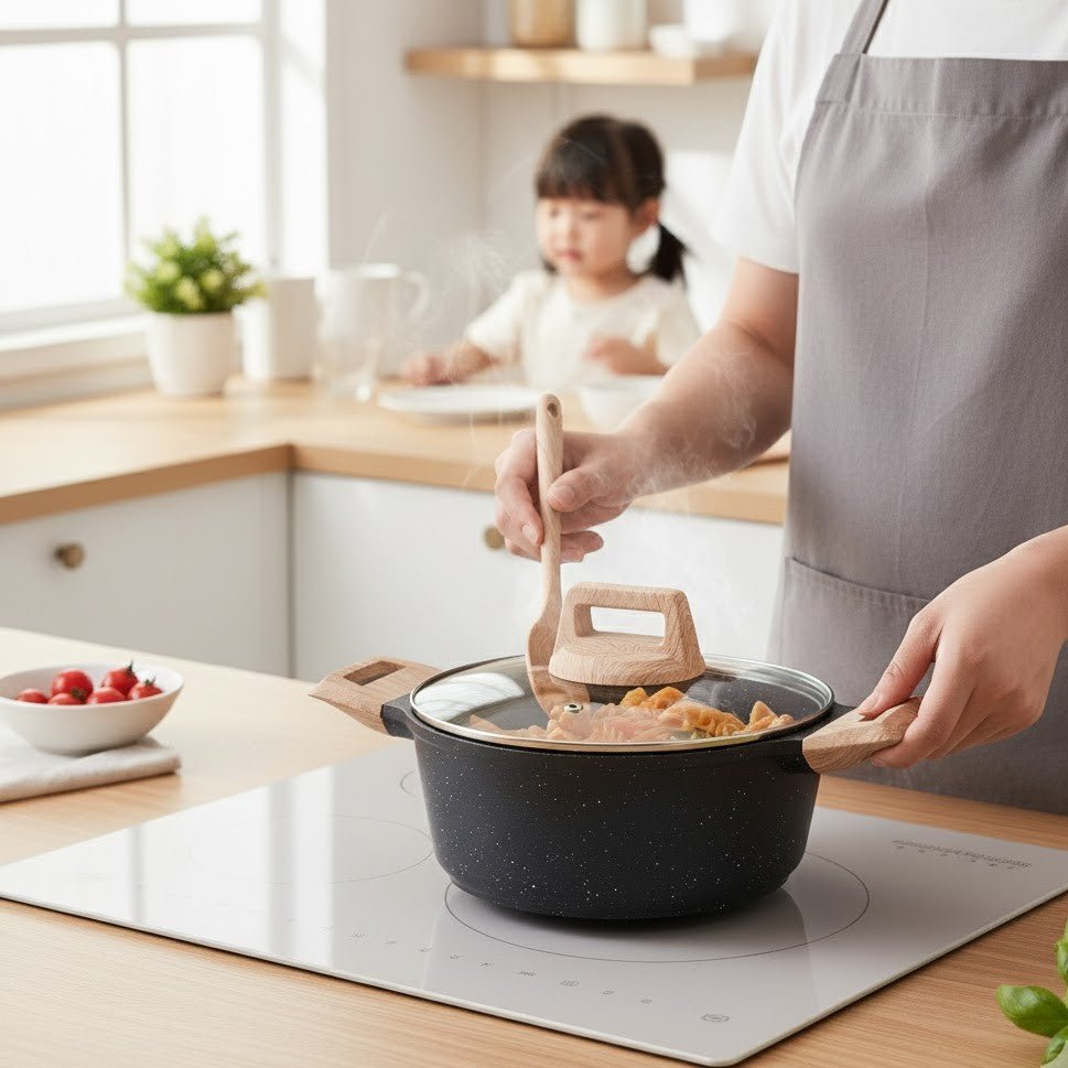 Maifan Stone Coating: The Maifan stone non-stick saucepan with lid ensures healthier cooking with less oil and easy food release.