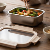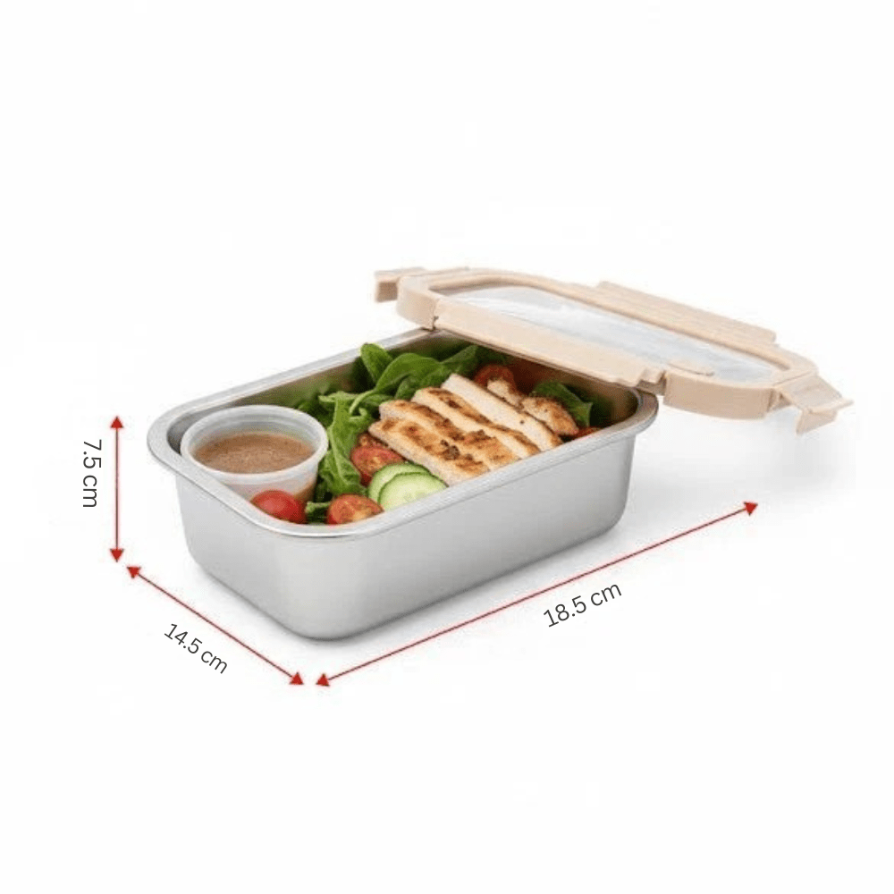Keep meals fresh and organized with this 800ml rectangular stainless steel food container featuring an airtight tempered glass lid. Designed with food-grade SS304 material, it offers durability, freshness preservation, and eco-friendly use. The silicone-sealed lid provides secure leak protection, making it ideal for lunch, snacks, meal prep, and fridge storage. Lightweight, portable, and stackable, this container delivers long-lasting performance for home, office, school, or travel.