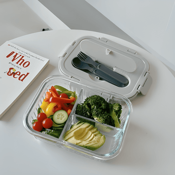This borosilicate glass food storage container features a practical two-compartment design to keep meals neatly separated. Equipped with an airtight, leakproof lid, it preserves freshness while offering microwave-safe, freezer-safe, and dishwasher-safe convenience for everyday food storage and meal organization.