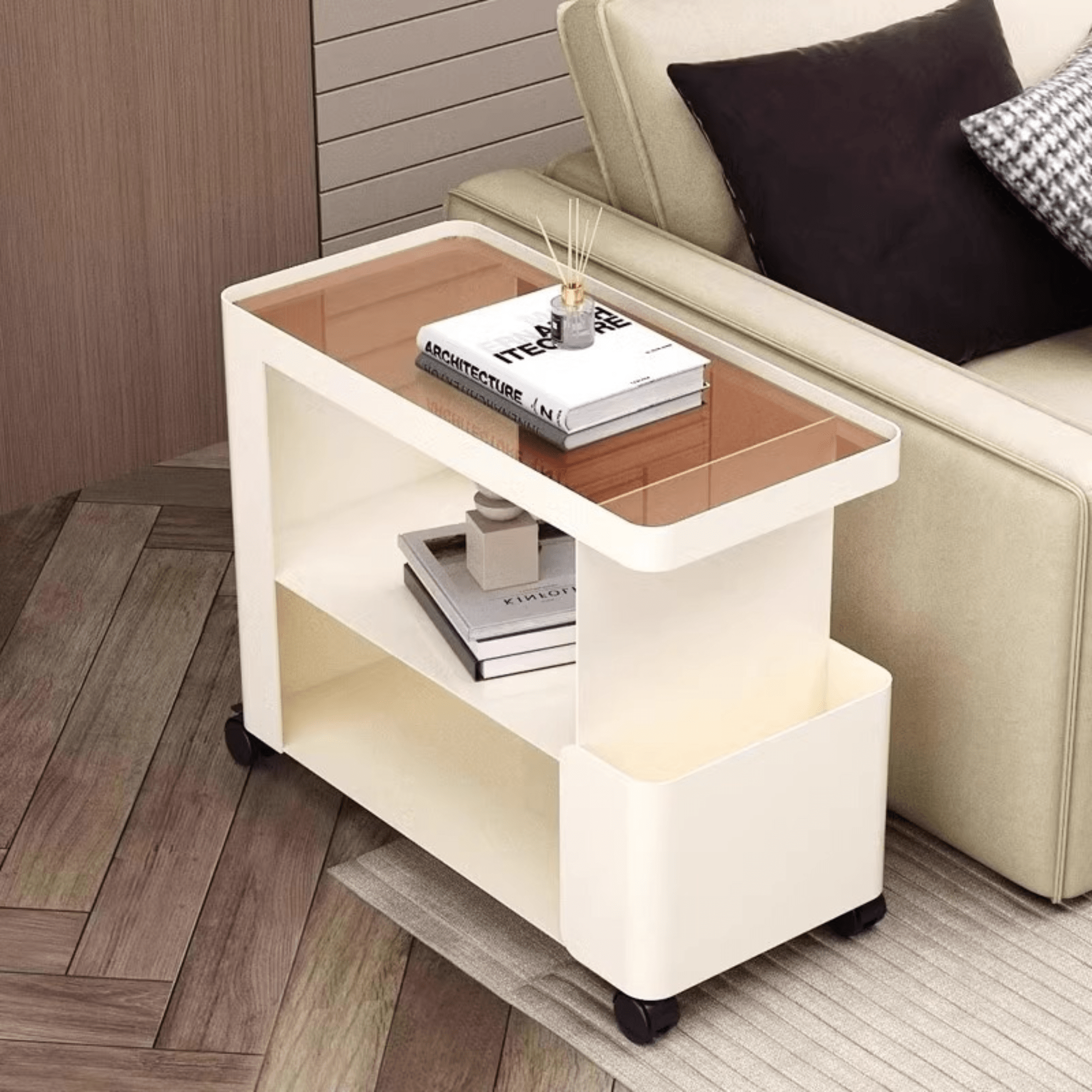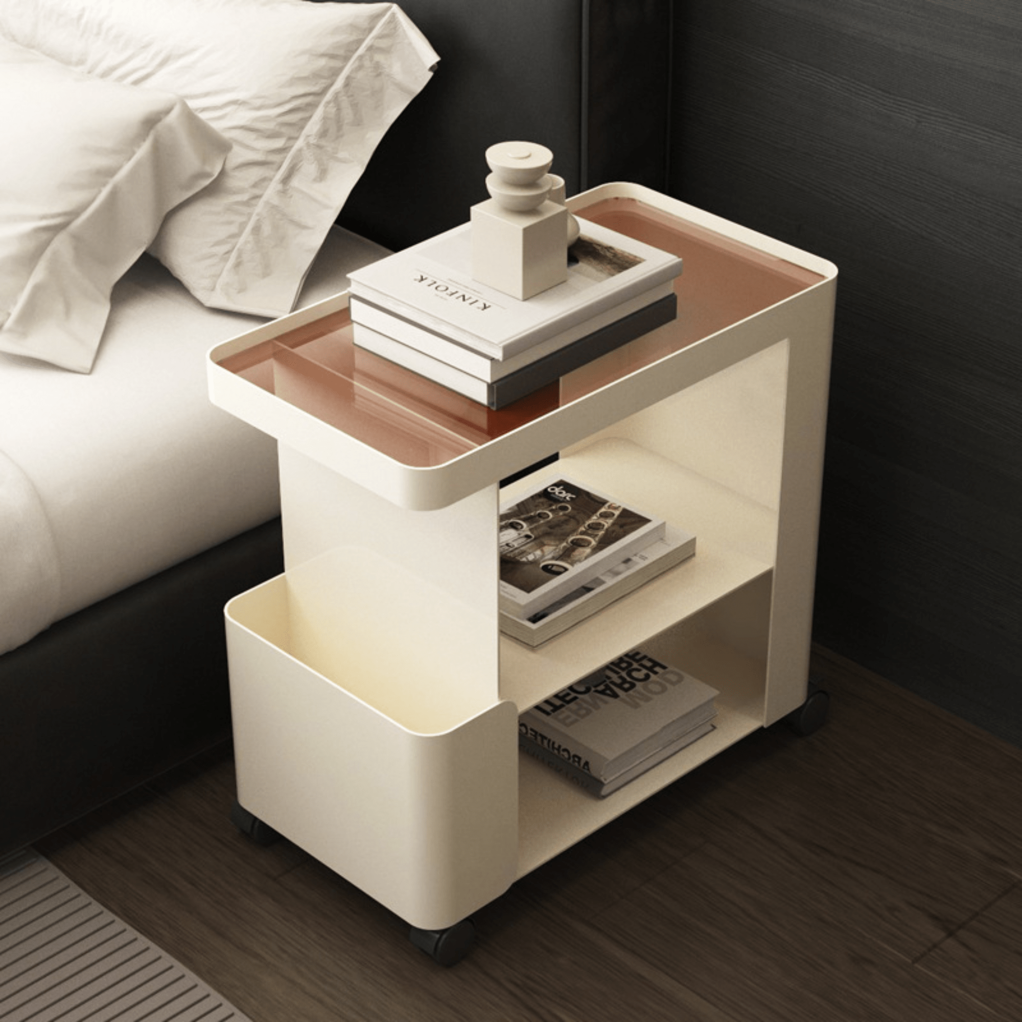 The bedside table storage with wheels glides effortlessly, making room rearranging and cleaning easy.