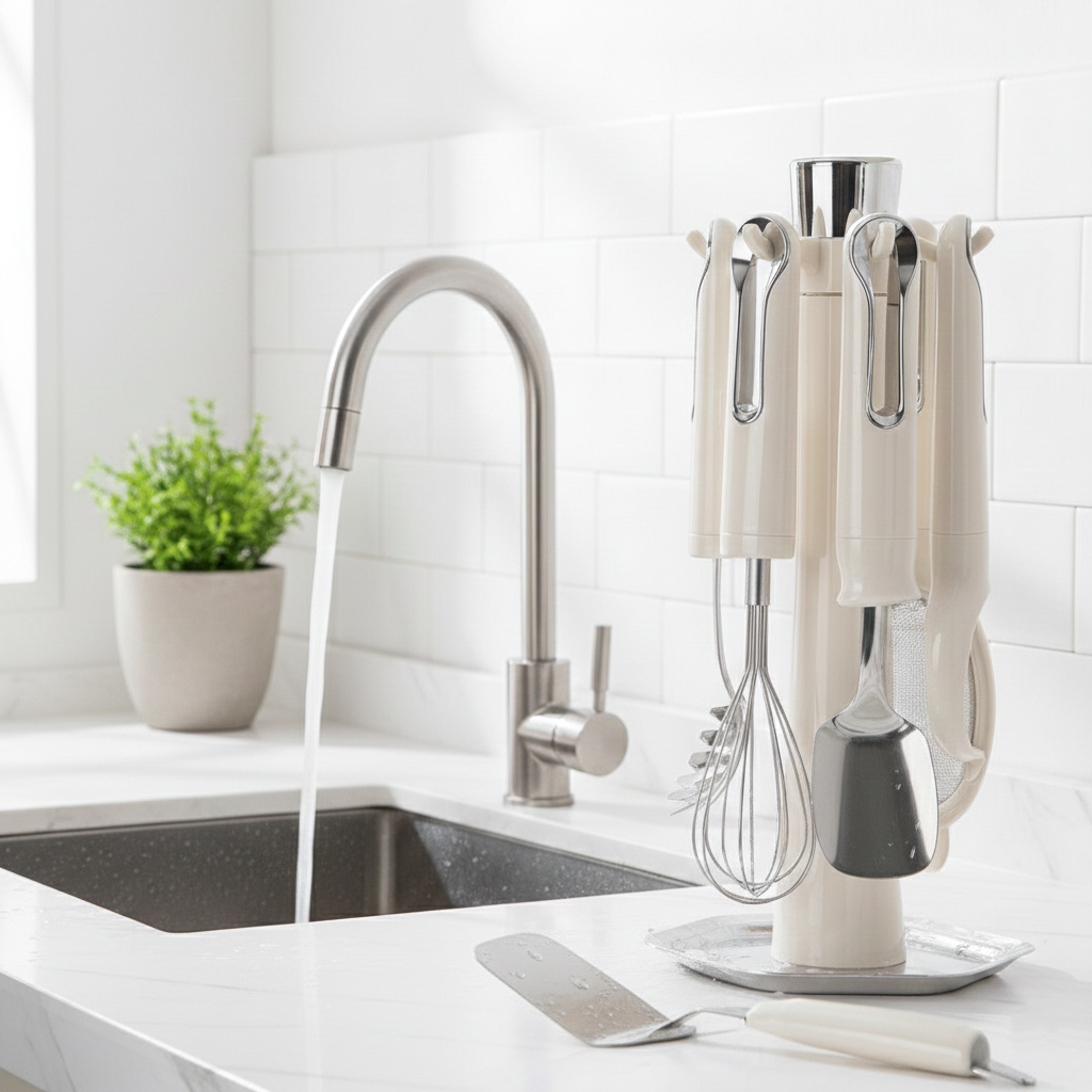 After washing, dry the stainless steel kitchen tools with stand completely with a clean cloth to prevent water spots.