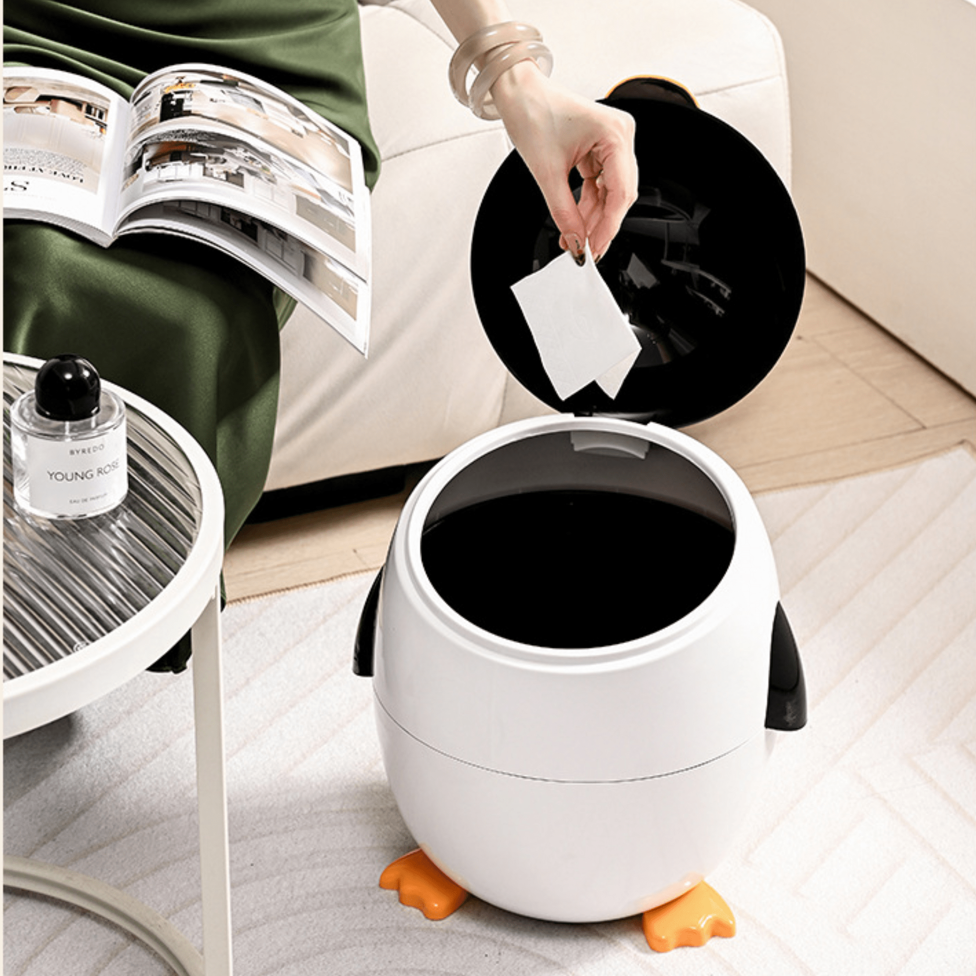 1 × Cartoon Penguin Trash Can (with flip-top lid)