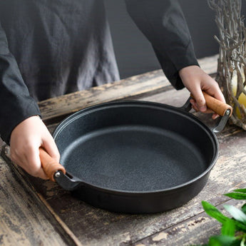 - Hand wash the cast iron non-stick frying pan with lid with warm water and a soft sponge to preserve the non-stick surface.
