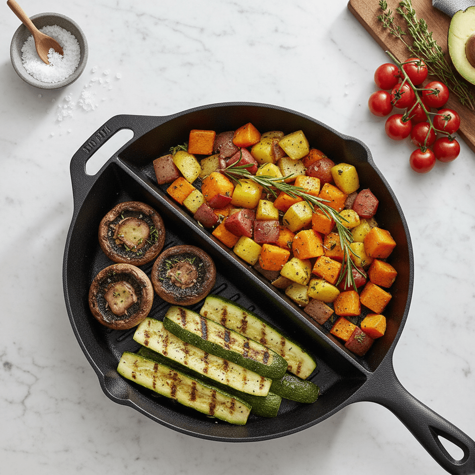 The Multi-Purpose Cast Iron Flat & Grooved Cooking Pan (32cm) is a versatile addition to any modern kitchen. Crafted from durable cast iron cookware, this cast iron multipurpose cooking pan features both a flat and grooved surface, making it ideal for grilling, sautéing, frying, and even searing. With its large 32cm size and ergonomic handle, it’s perfect for preparing family meals and enhancing your cooking experience with even heat distribution and long-lasting performance.