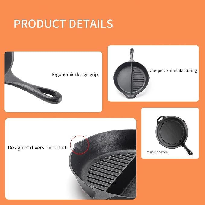 - Dual Surface Design: The cast iron grill pan has a flat surface for general cooking and a grooved surface for grilling, offering versatility for various cooking needs.