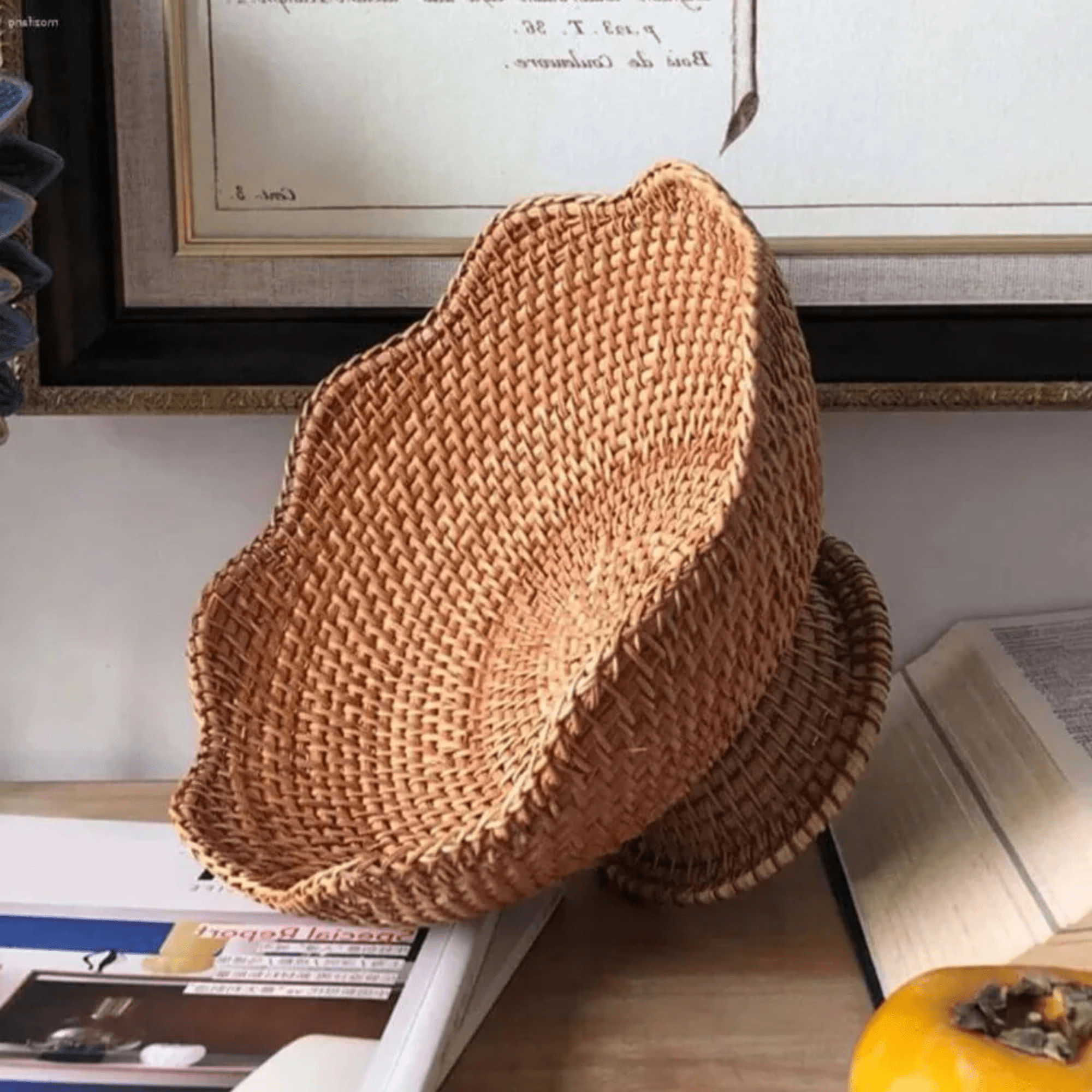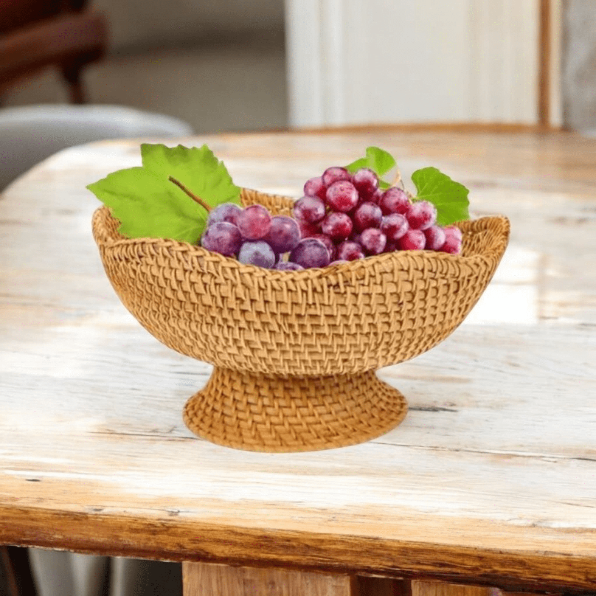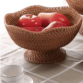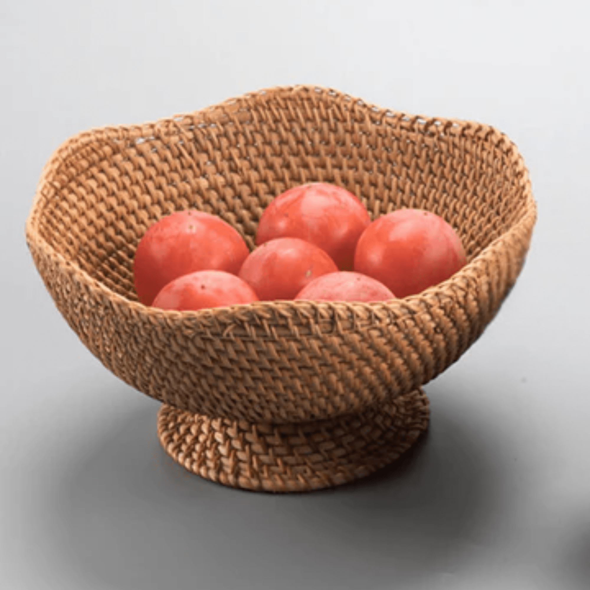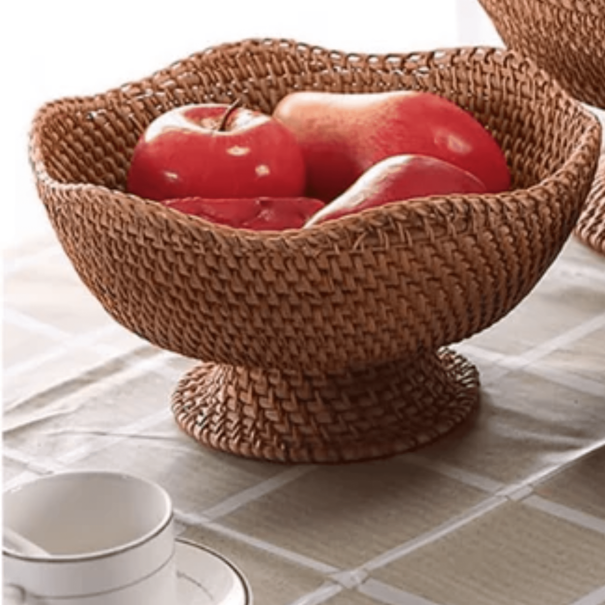 Hand-woven rattan basket adds a rustic charm to any space. Ideal for serving bread, fruits, or storing small essentials, this lightweight and eco-friendly basket brings natural elegance and functional storage to your kitchen or living area.