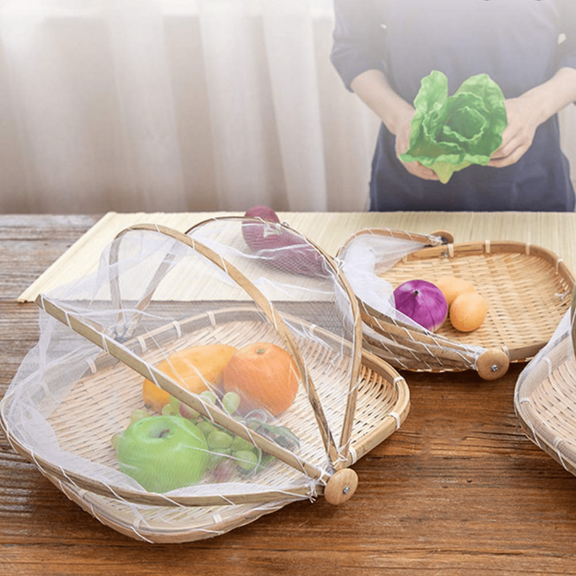 This handwoven bamboo basket set is designed for food storage and protection. Featuring a breathable mesh cover, it keeps fruits, vegetables, and dry goods safe from insects while allowing air circulation. The durable and eco-friendly design makes it perfect for home, picnics, and food displays.