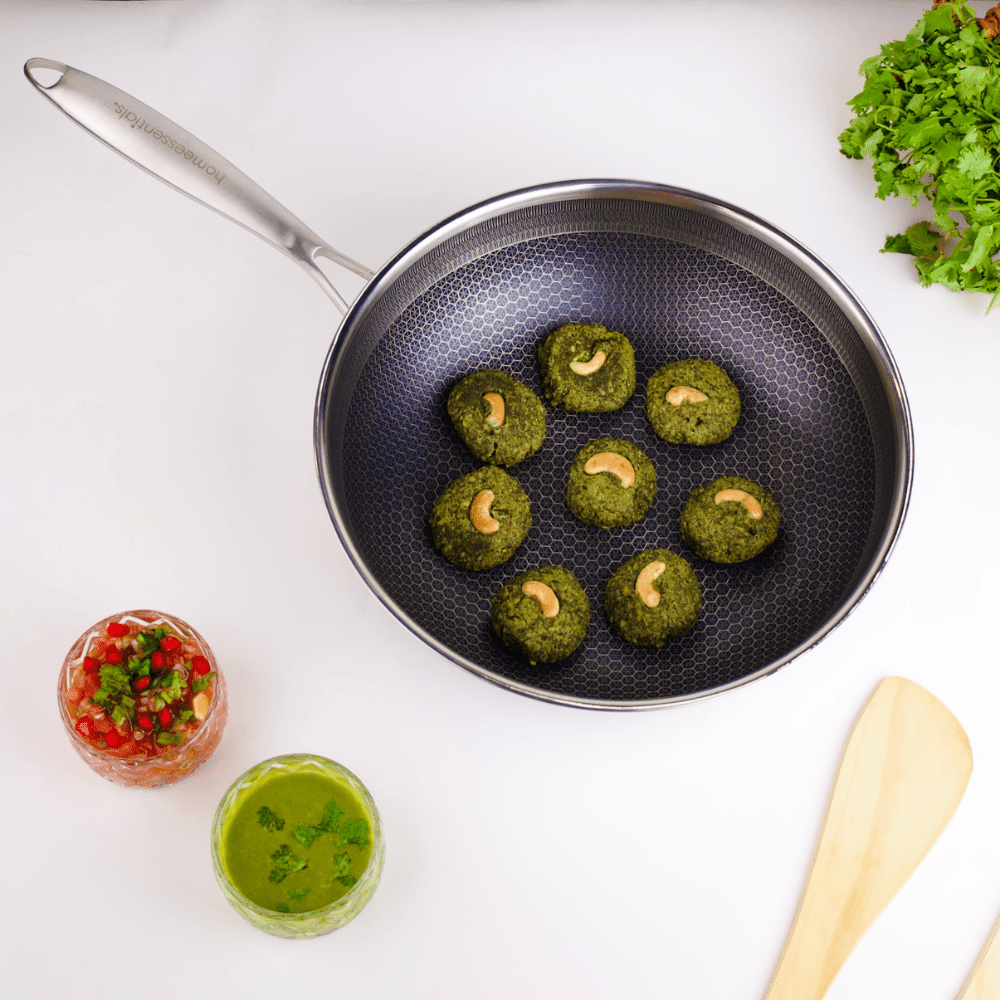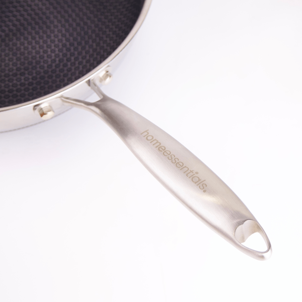 Elevate your cooking experience with this Deep frying Pan. Home Essentials brings you stainless steel cookware, with this honeycomb deep frying pan featuring a unique honeycomb surface that ensures even heat distribution and reduces oil usage. Its ergonomic handle provides a comfortable grip, and the composite lid helps retain moisture and flavors, making it ideal for frying, sautéing, and simmering. Whether you're preparing a quick breakfast or a family dinner, this versatile pan offers both functionality and style.