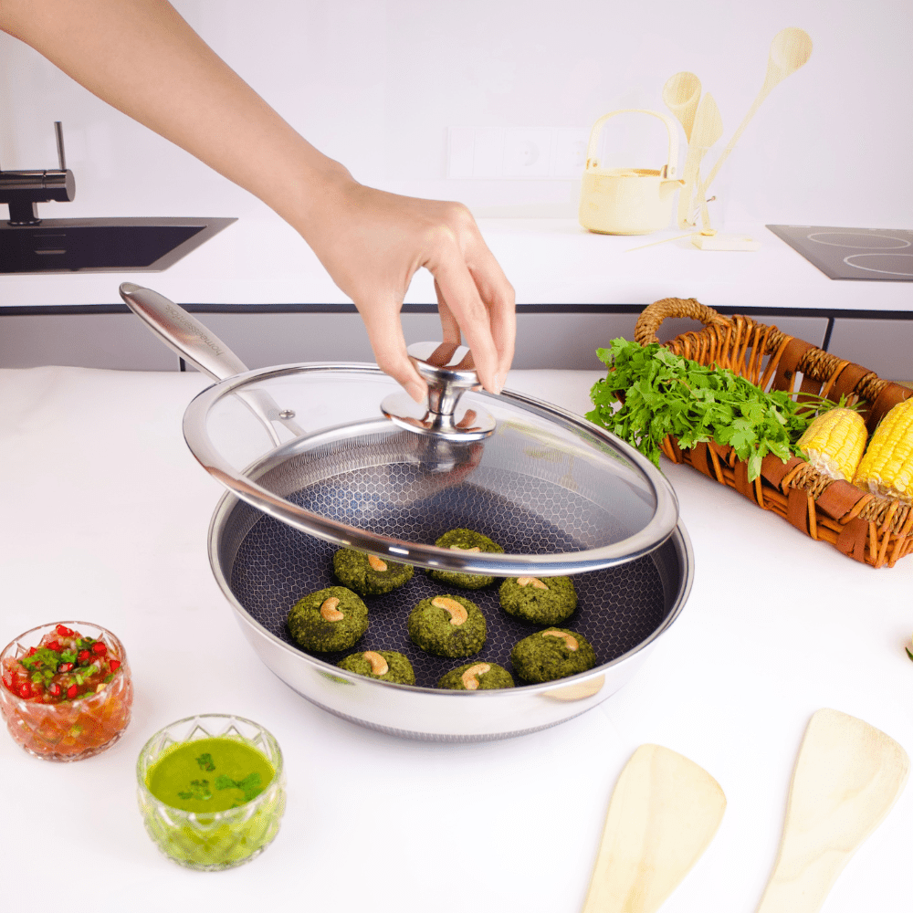 Multi-Purpose Honeycomb Stainless Steel Deep Frying Pan with Composite Lid (28 cm)
