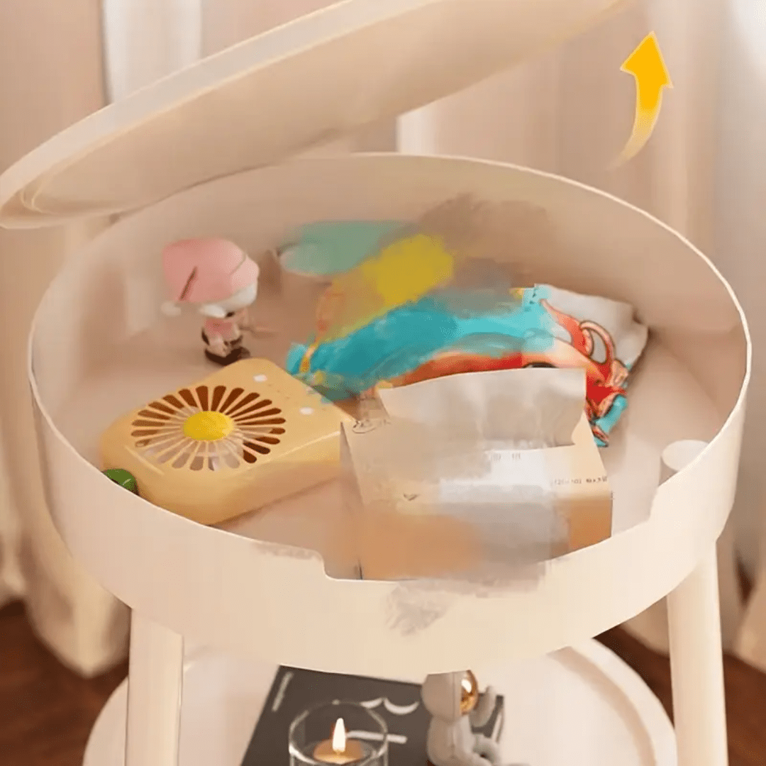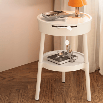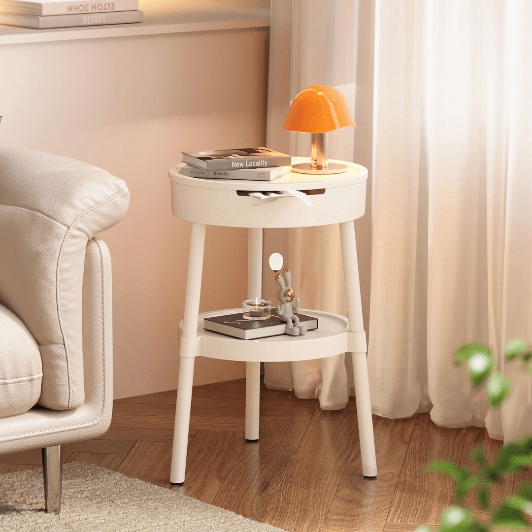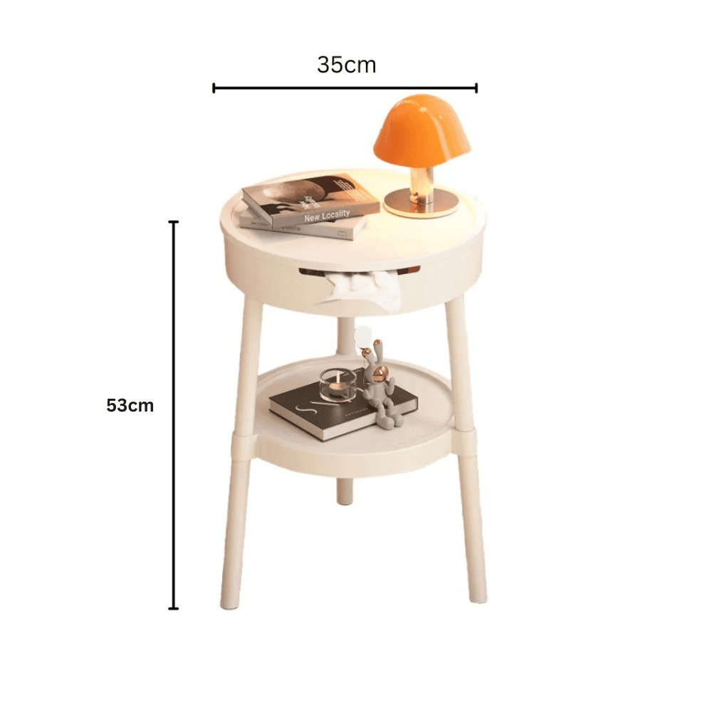 Offers a round tabletop for decor or essentials and a lower shelf for extra storage, making it highly functional in compact spaces.