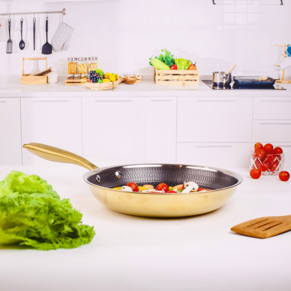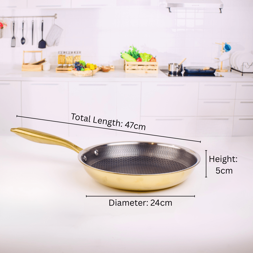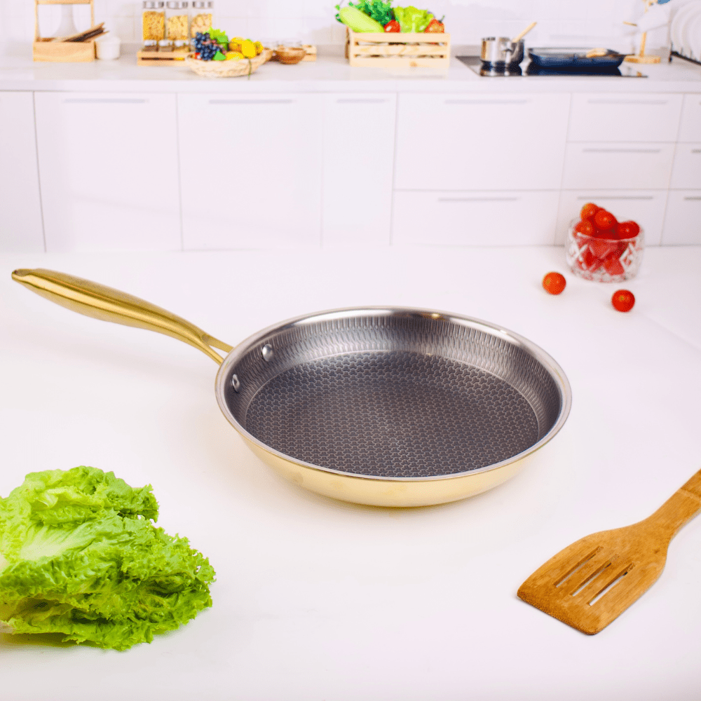 Add elegance and performance to your kitchen with the Multi-Purpose Stainless Steel Gold Honeycomb Frying Pan (24 cm). Crafted with durable 304 stainless steel and from the honeycomb cookware collection, this feature ensures even heat distribution, minimal oil usage, and easy cleaning. Perfect for daily frying, sautéing, and Indian cooking, its gold finish blends style with practicality for modern homes.