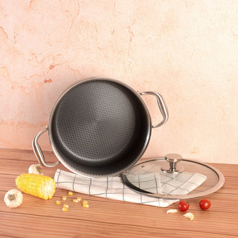 Laser-etched honeycomb texture protects the surface. Use metal utensils with confidence. Food releases with minimal oil. Browning stays crisp, and sauces do not stick. This steel cooking pot keeps flavors clean.
