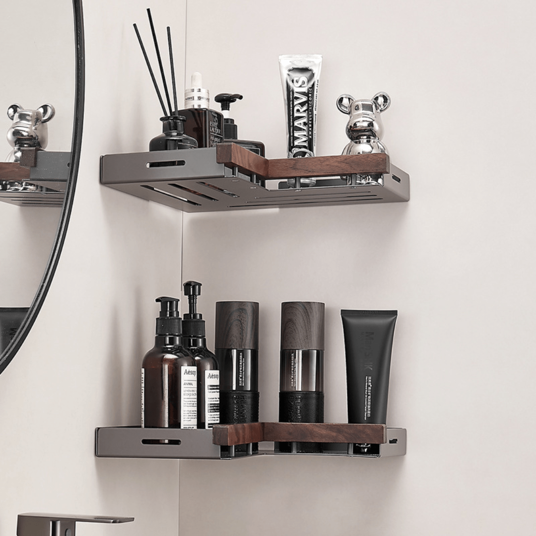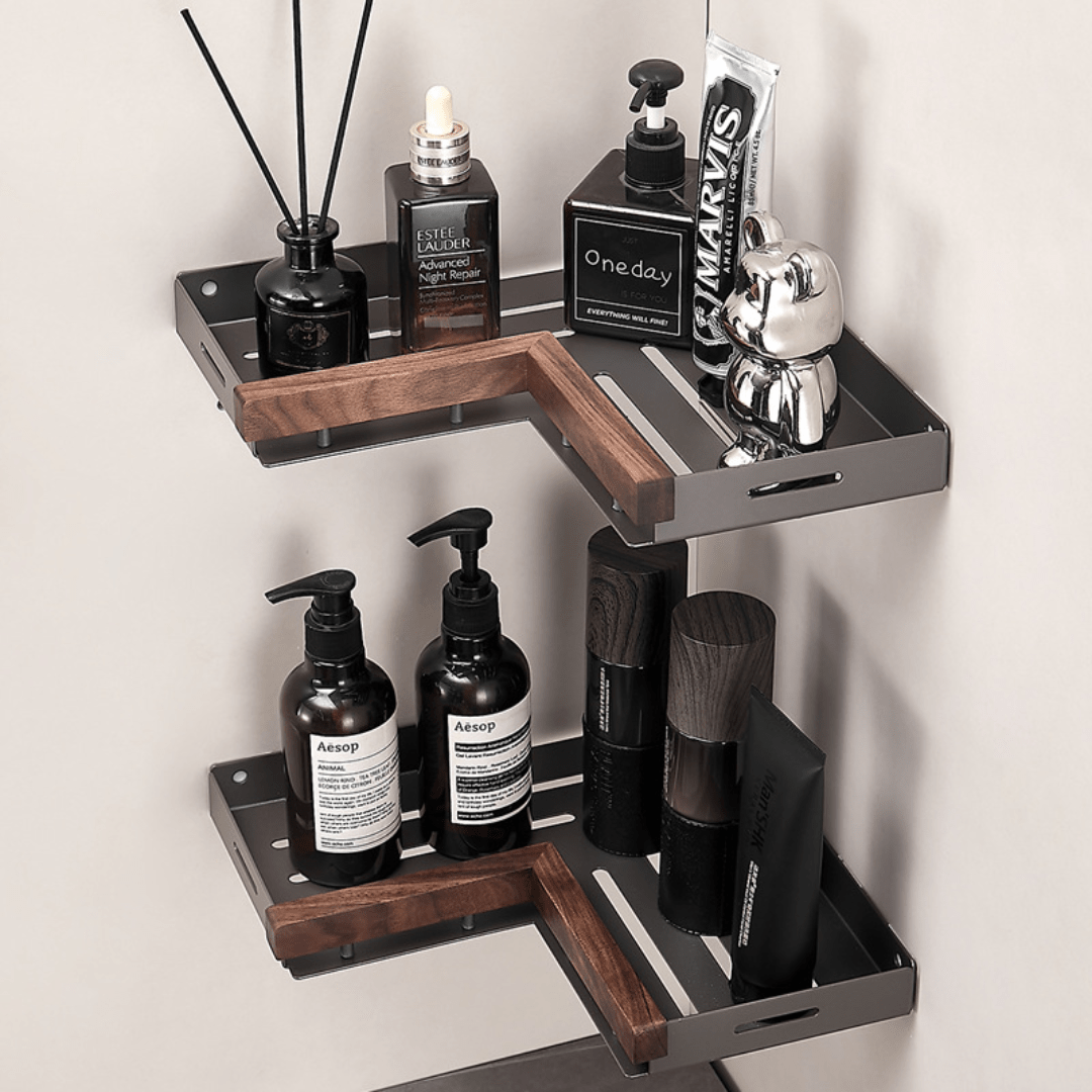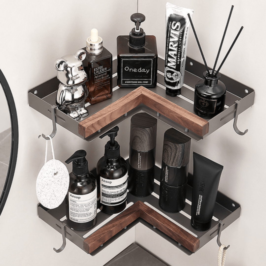 Our elegant corner shelf combines solid wood and aluminum to create a durable and moisture-resistant storage solution. Perfect for bathrooms and toilet corners, it features adjustable spacing, rounded edges, and easy installation with no drilling required.