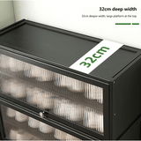 The hazy, light-transmitting flip cover allows for easy identification of stored items while keeping dust at bay. Designed with a hovering mechanism, it remains securely open when lifted, making it effortless to retrieve or store shoes. The exquisite round handle ensures a comfortable grip, combining aesthetics with practicality.