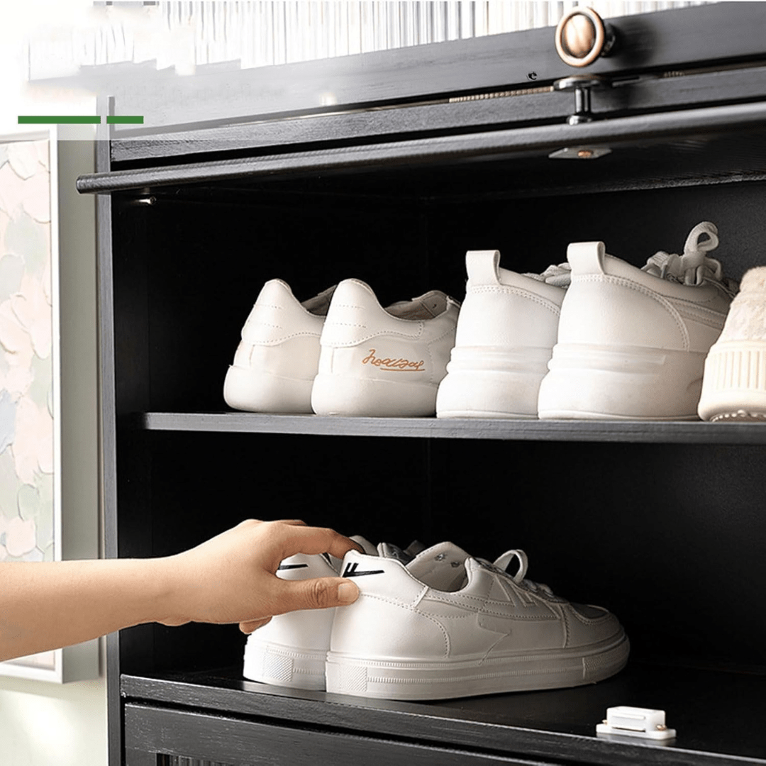 Featuring a sealed back, side panels, and laminate shelves, this rack effectively protects items from dust and dirt. Unlike open shoe racks, it keeps footwear clean and well-maintained, reducing the need for frequent cleaning while adding a sleek, clutter-free look to any space.