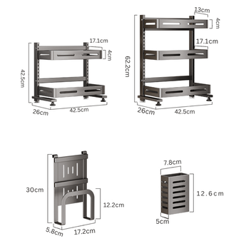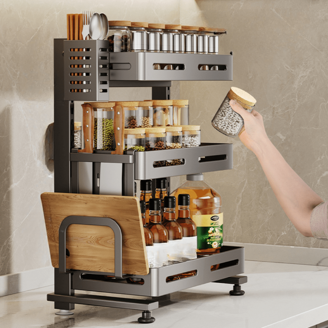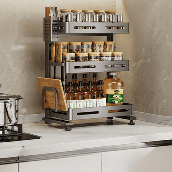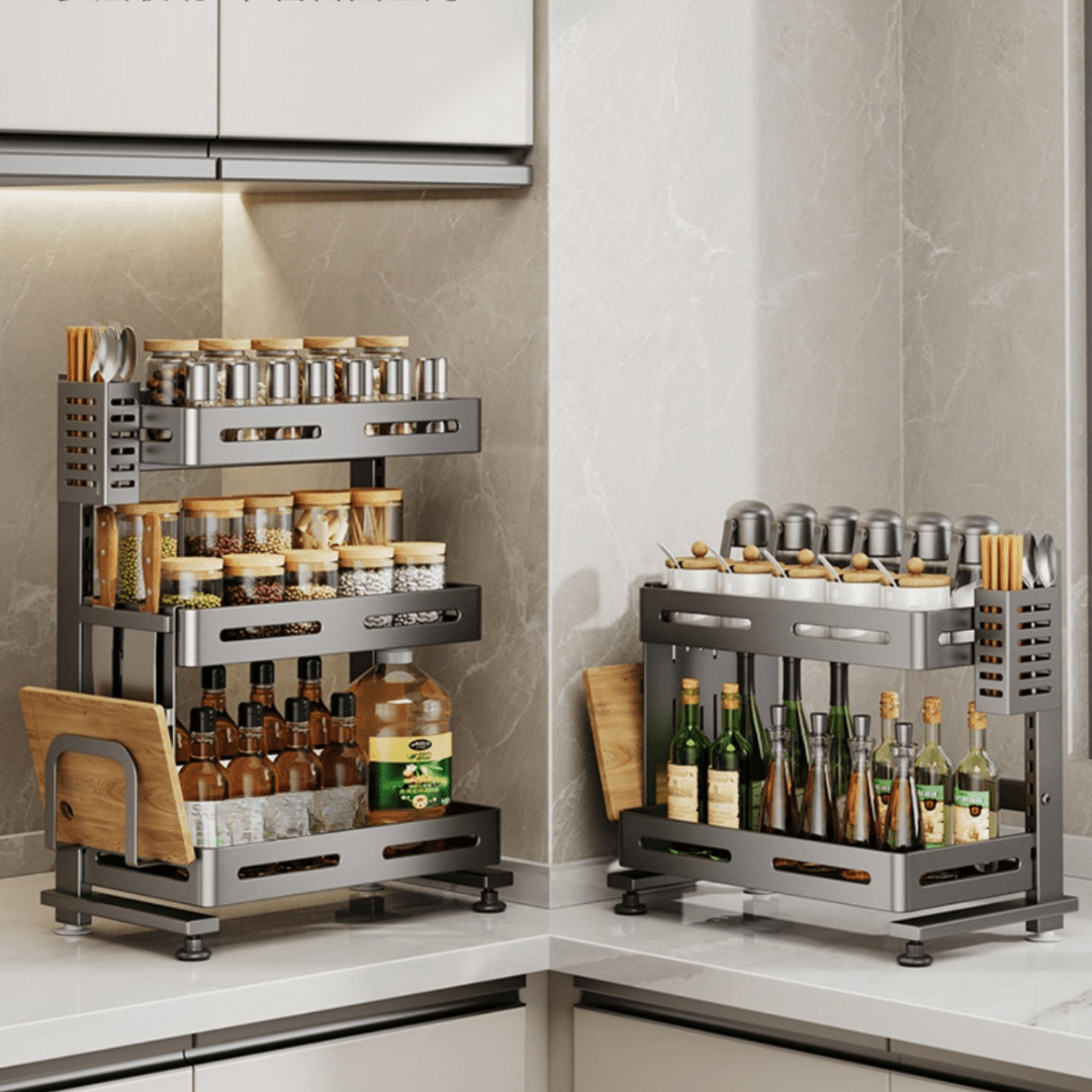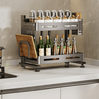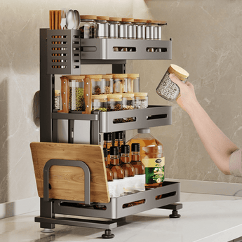 Maximize your kitchen space with this multifunctional stainless steel seasoning rack. Designed for durability and style, it features adjustable layers, anti-slip foot pads, and a reinforced structure for heavy storage. With dedicated compartments for spices, utensils, cutting boards, and bottles, everything stays neatly organized and within reach. The anti-corrosion and rust-resistant coating ensures long-term hygiene and shine, making it an essential storage upgrade for any modern kitchen.