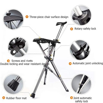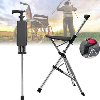 This innovative 2-in-1 walking stick with seat is designed for elderly users and travelers. Made from durable aluminum alloy, it functions as a sturdy walking aid and unfolds into a stable chair in seconds. With a three-piece ergonomic seat, anti-slip rubber feet, and a safety locking mechanism, it offers both comfort and convenience on the go. Lightweight yet strong, it supports up to 70 kg and folds easily for travel, outdoor use, or long-standing queues.