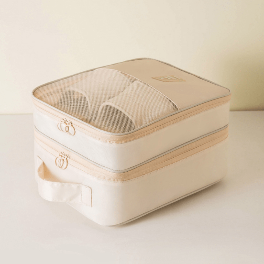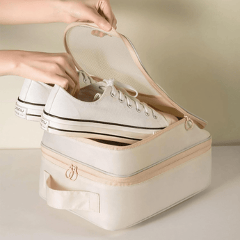 This travel shoe bag offers one main compartment for larger shoes like sneakers and two side mesh pockets for sandals or flats. Each shoe is stored separately to prevent dirt transfer, making your suitcase cleaner and more organized.
