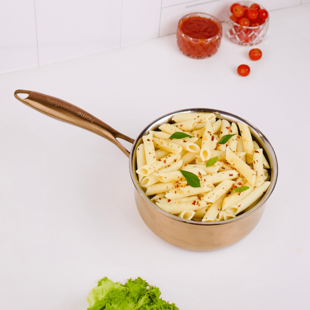 Works beautifully on induction, gas, electric, and ceramic hobs. The compact 18 cm size is ideal for oatmeal, noodles, chutneys, and reductions, and complements a honeycomb stainless steel frying pan for a complete, go-to set.