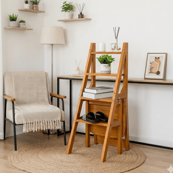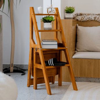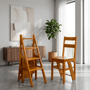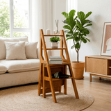 This handcrafted solid hardwood unit serves multiple purposes, functioning as a sturdy ladder, a comfortable seat, or a decorative display stand. Its space-saving collapsible frame folds flat for easy storage. Finished with a weather-resistant lacquer, it supports heavy loads with maximum stability and durability.