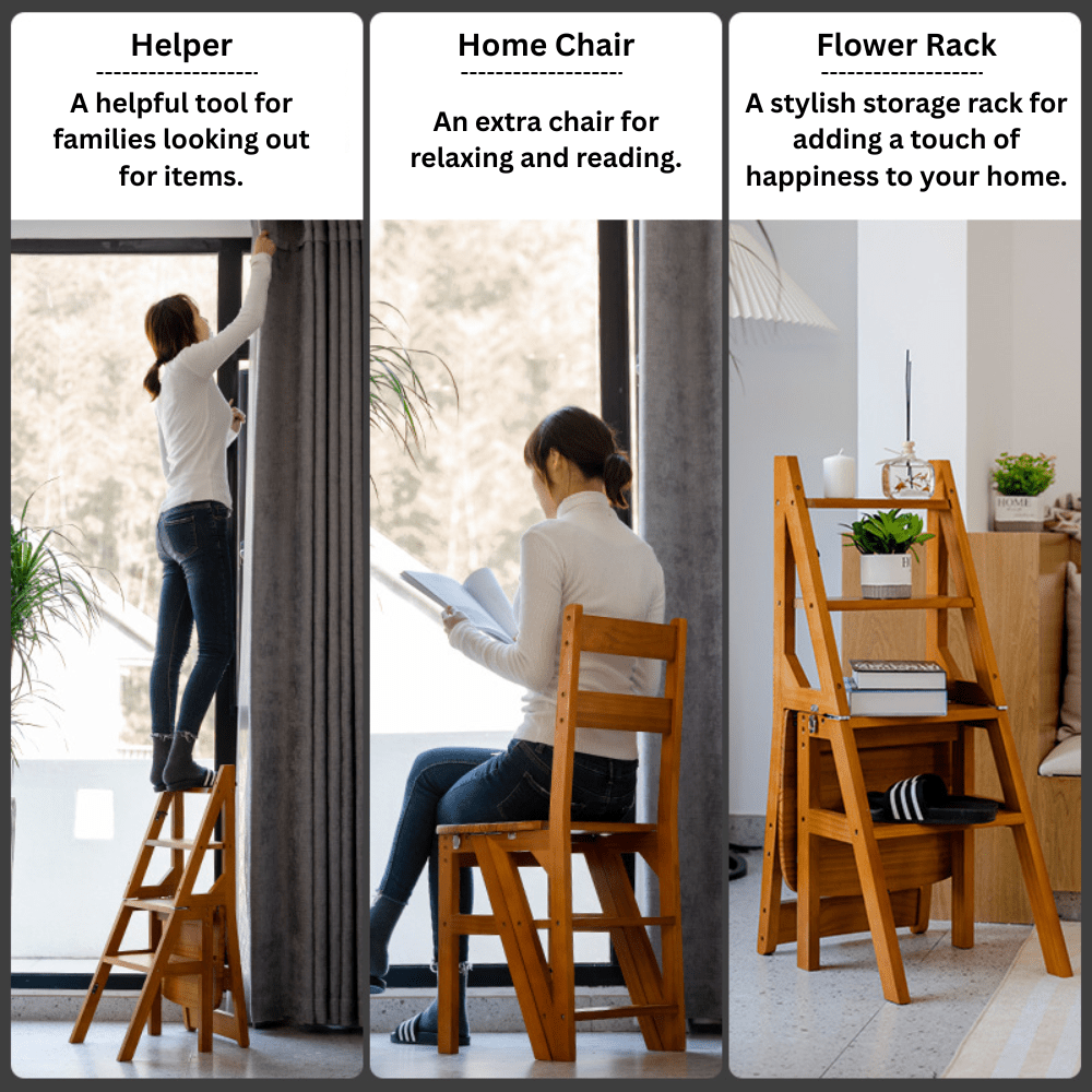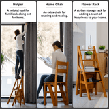Multipurpose Utility: Seamlessly transforms from a sturdy step ladder to a comfortable seating chair or a decorative plant stand, offering practical flexibility for various daily tasks and household organization needs.