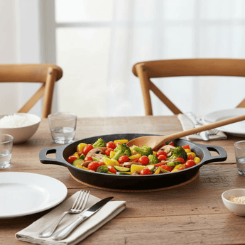 The Pre-Seasoned 24cm Cast Iron Skillet with Ergonomic Grip is a versatile and durable addition to any kitchen. Crafted from premium cast iron cookware, this cast iron skillet ensures excellent heat retention, perfect for frying, sautéing, searing, and more. Its pre-seasoned surface offers easy food release, while the ergonomic grip provides comfort and control, making it ideal for everyday cooking for small families.