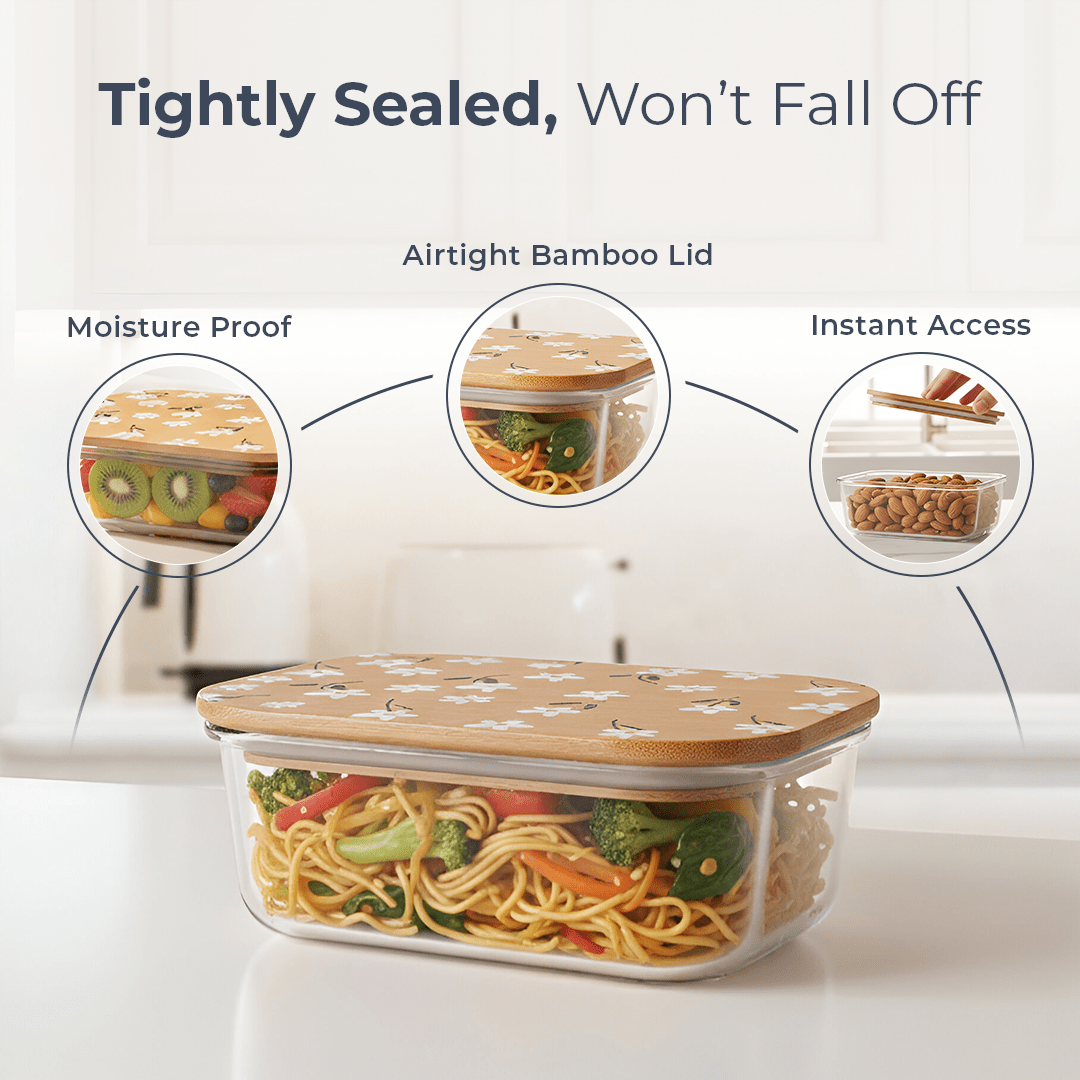 The eco-friendly bamboo lid is fitted with a food-grade silicone gasket that creates an airtight seal. It locks in freshness, prevents moisture entry, and keeps odors out while giving your kitchen a warm, natural, premium appearance.