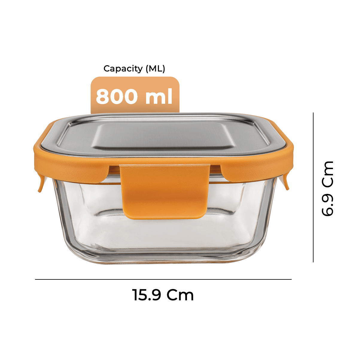 - Square 800 ml: 15.9 (L) × 15.9 (W) × 6.9 (H) cm