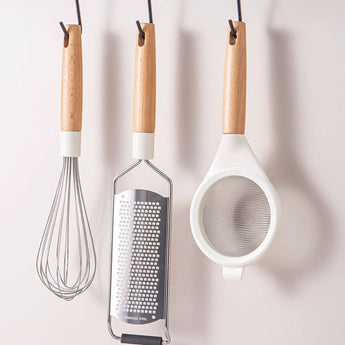 - Set of 1 Contains - 1 x Wooden handle whisk, 1 x Wooden handle filter, 1 x Wooden handle cheese shaving