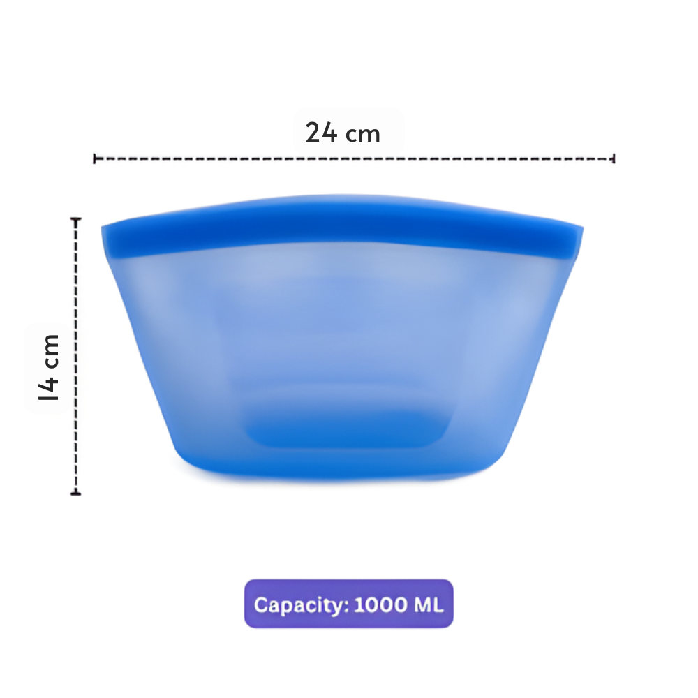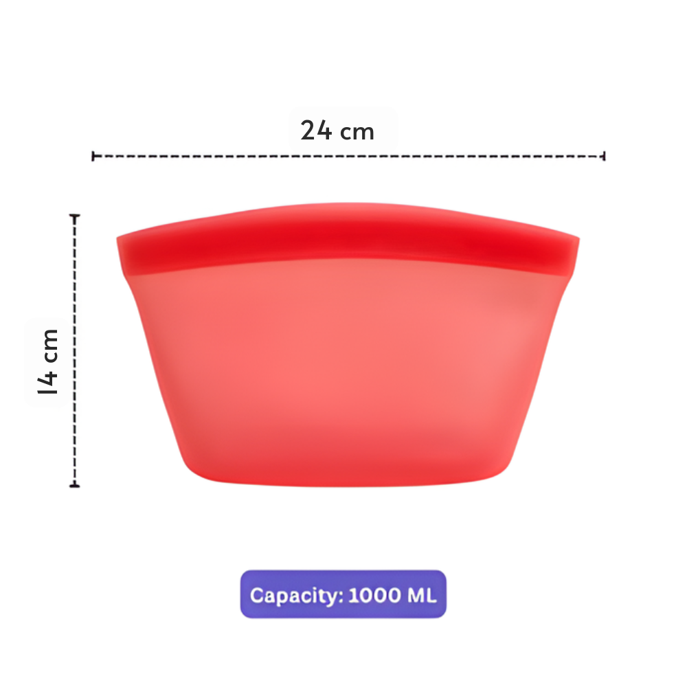 Reusable silicone food storage bags made from durable, food-grade silicone with a self-standing base for easy filling and access. Featuring a leakproof, airtight seal, these bags keep food fresh and secure while being safe for microwave, freezer, dishwasher, and even boiling water use.