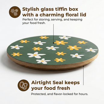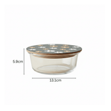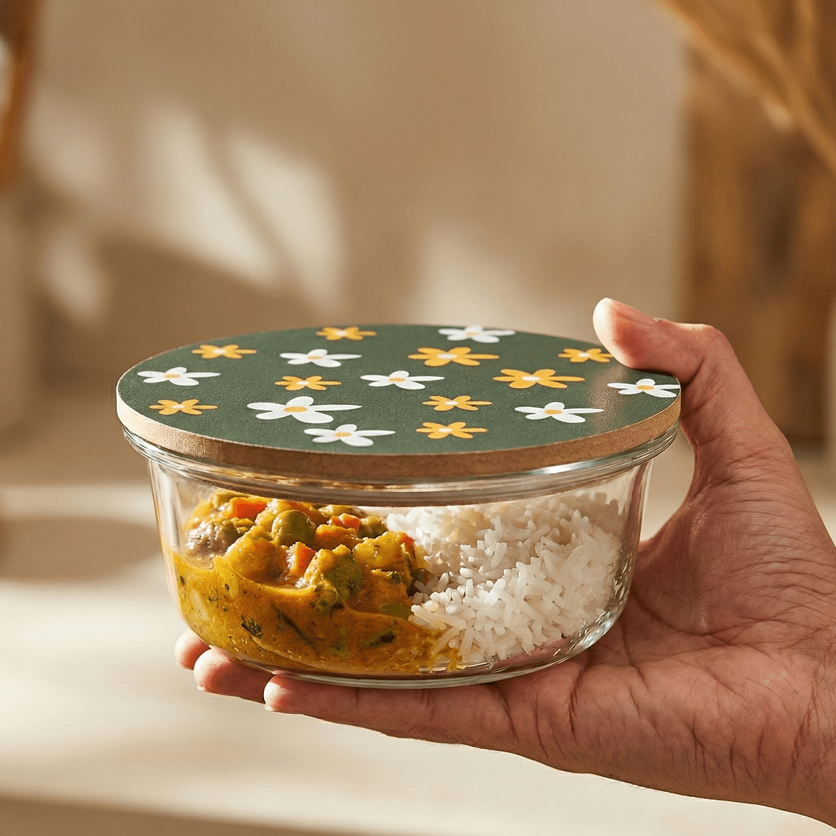 This Round Borosilicate Glass Food Container with a beautifully printed lid is designed for everyday storage with a touch of style. Made from high-quality borosilicate glass, it safely holds hot or cold foods while resisting stains, odors, and thermal shock. The printed lid adds a decorative touch while offering secure sealing to keep meals, snacks, or leftovers fresh. Perfect for home, office, school lunch, or refrigerator organization.
