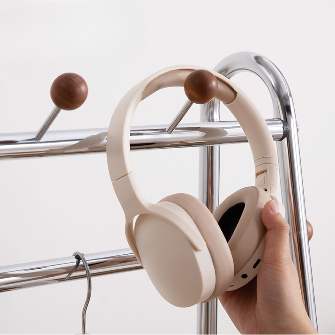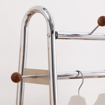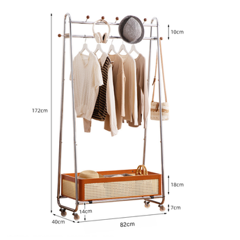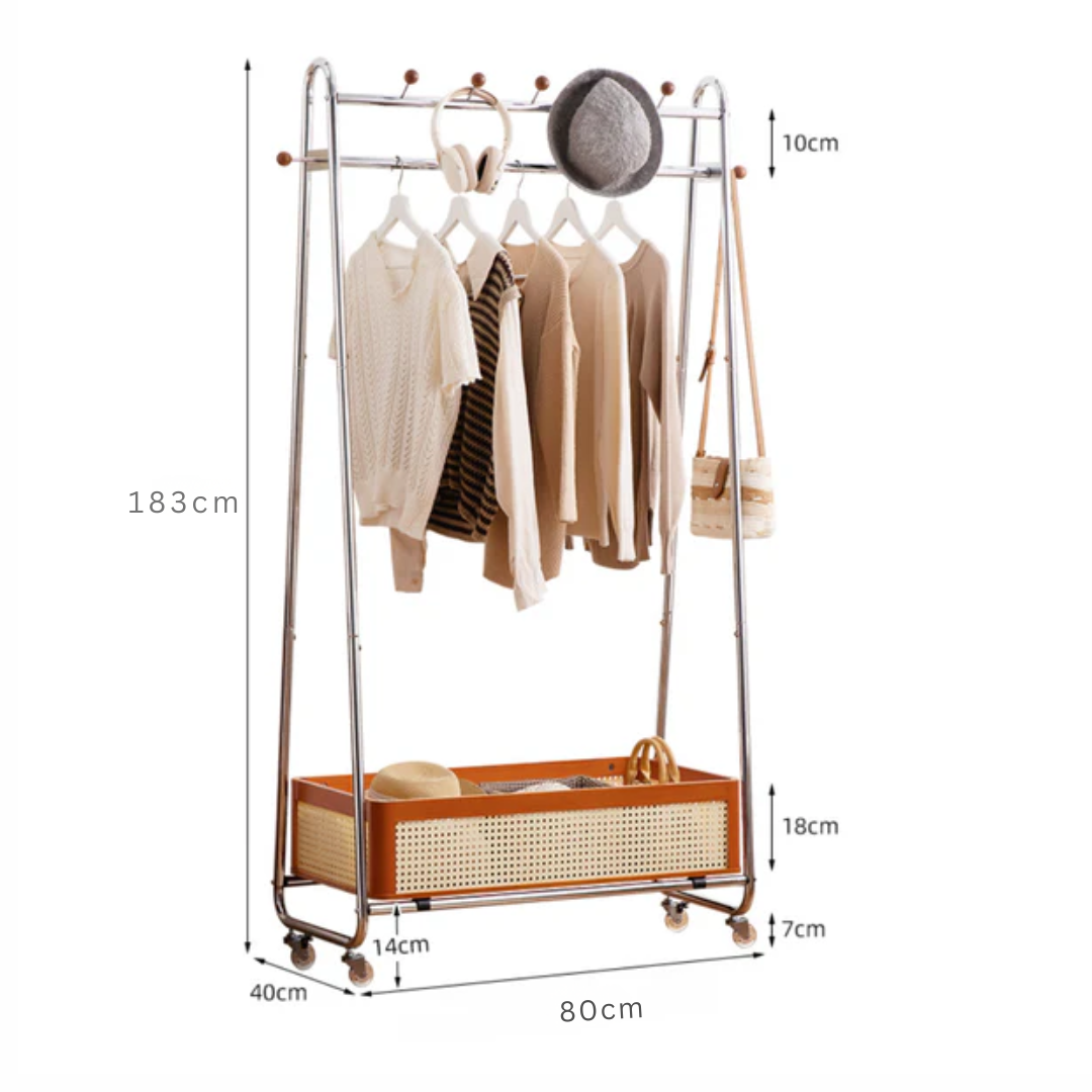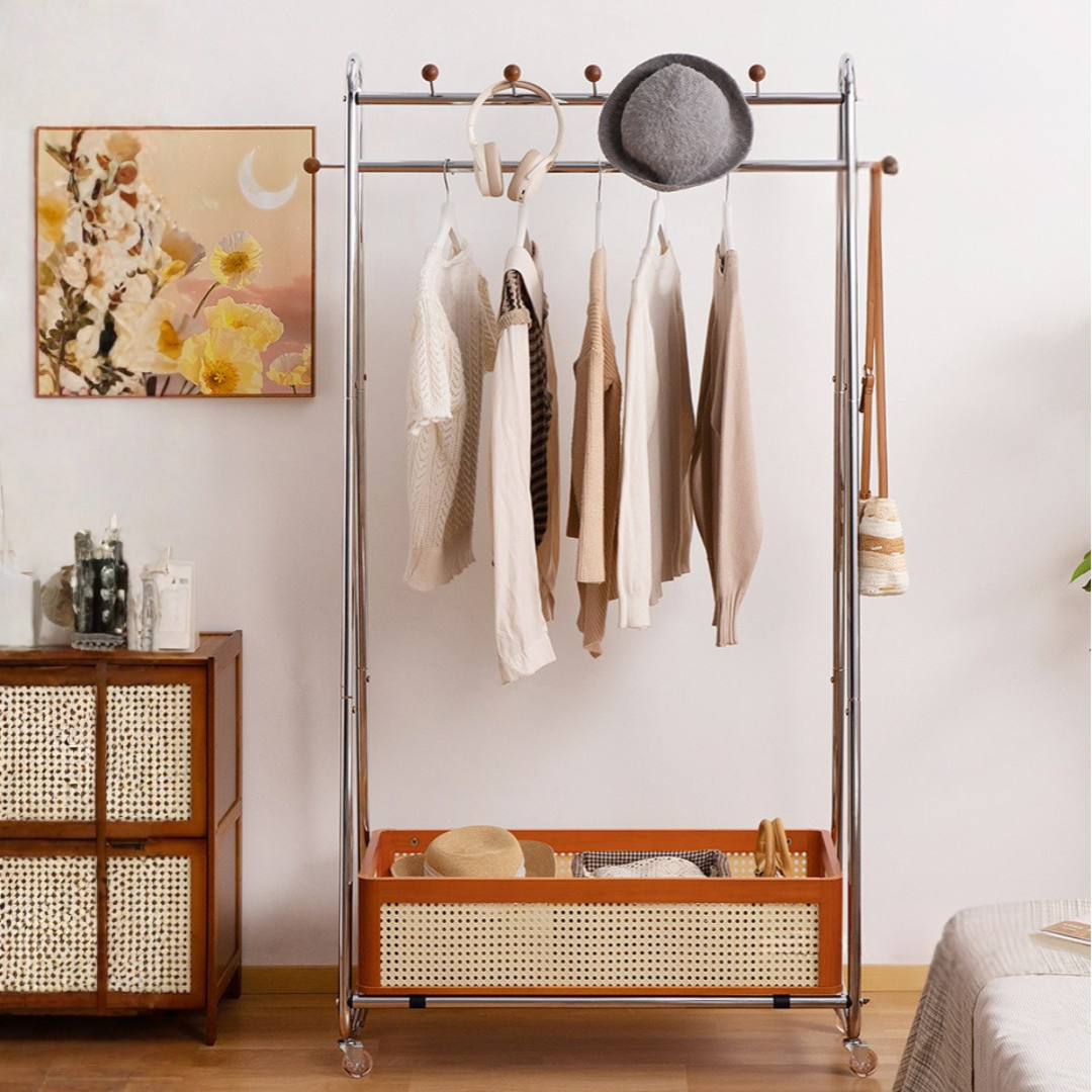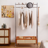 This solid wood floor standing clothes rack offers a practical storage solution for bedrooms or entryways. Designed with a durable steel frame, hanging rod, and integrated storage basket, it keeps clothes, bags, and accessories neatly organized while maintaining a modern and compact space saving design.
