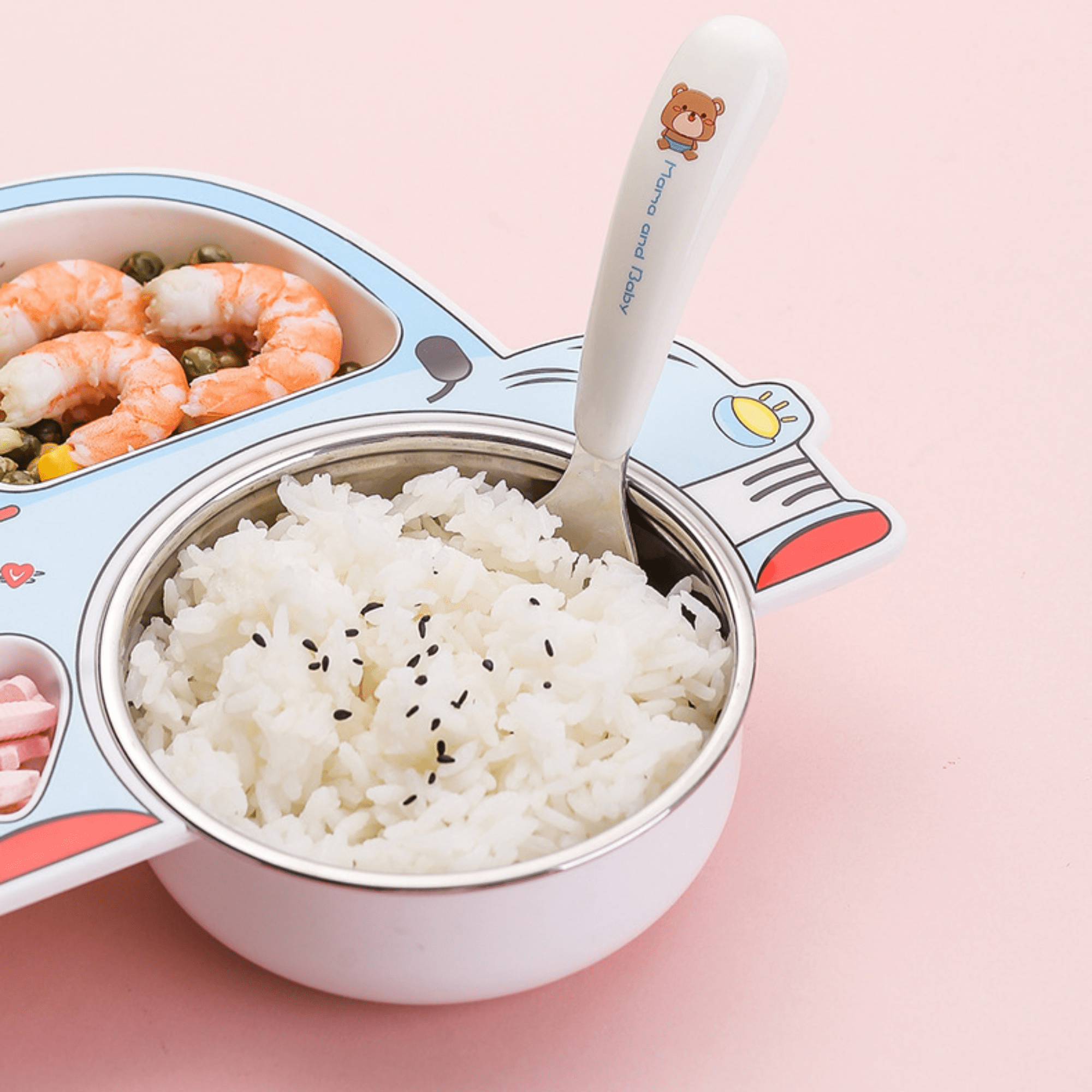 Designed with engaging cartoon-style compartments that separate food items, making mealtime more enjoyable while encouraging balanced nutrition and flavor separation.