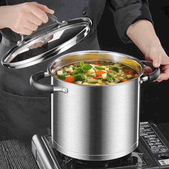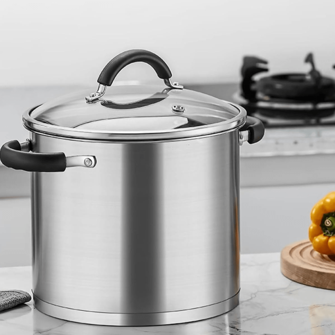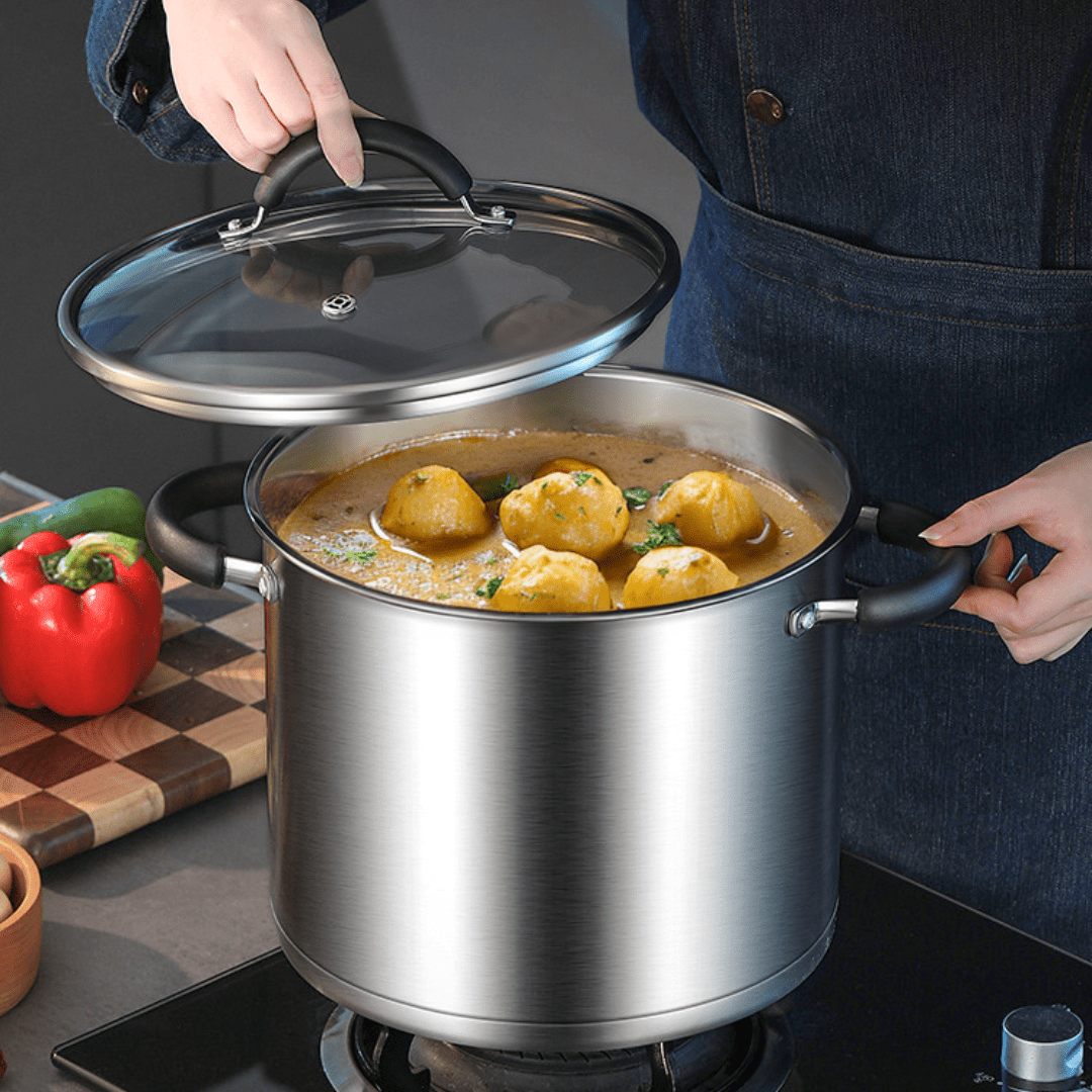 The Stainless Steel Deep Cooking Pot is designed for both home and commercial use, offering a large-capacity solution for cooking rice, vegetables, soups, and boiling noodles, veggies, and water, etc. With a right-angled deepened design, it prevents overflow, while the three-dimensional heating system locks in flavors. The tempered glass lid provides visibility, making cooking effortless and enjoyable.