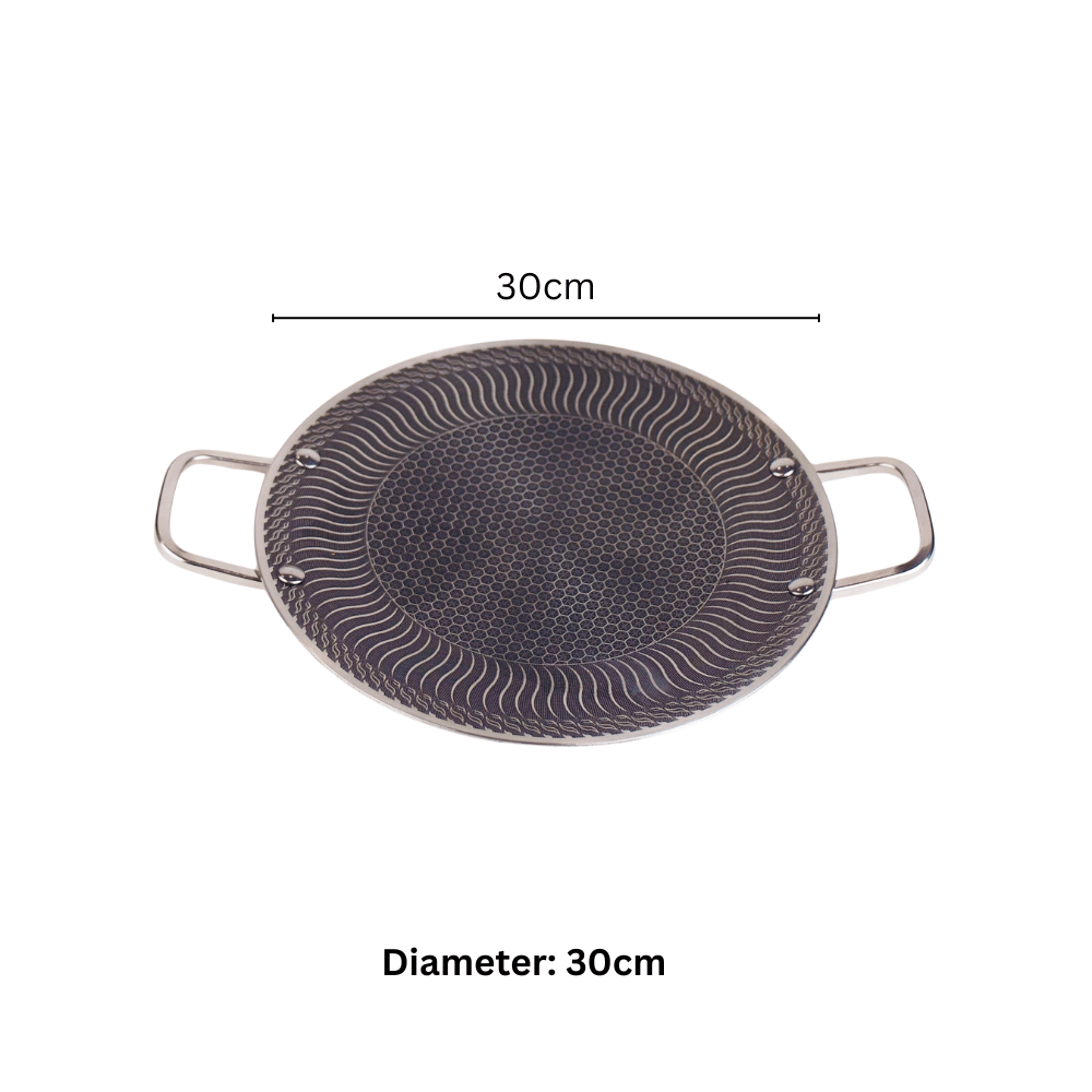 Introducing the Stainless Steel Honeycomb Multi-Purpose Pan & Tray with Handle (30 cm) - a versatile addition to your kitchen essentials. Home Essentials brings you high quality stainless steel cookware, with this honeycomb pan with handle featuring a unique honeycomb surface that ensures even heat distribution and reduces oil usage. Its ergonomic handle provides a comfortable grip, making it ideal for frying, grilling, and baking. Whether you're preparing a quick breakfast or a family dinner, this pan offers both functionality and style.